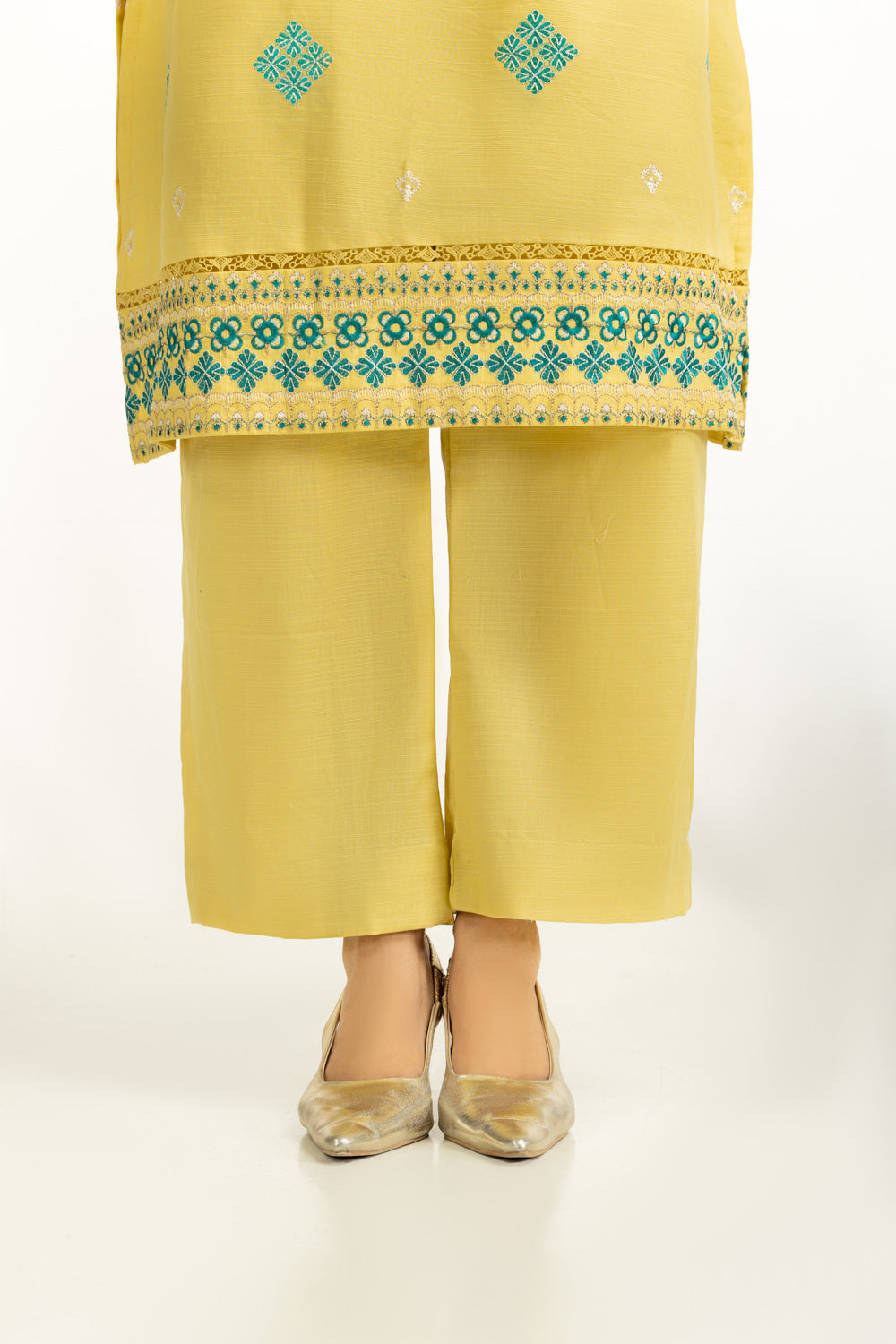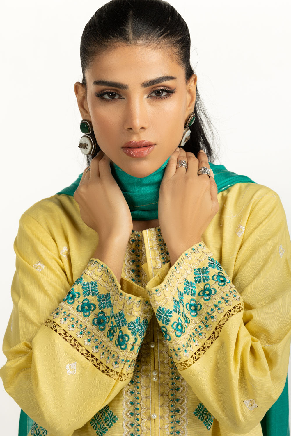 A lively yellow khaddar suit that stays reliable through winter days. The embroidered detailing gives it a soft ethnic charm without weighing the fabric down. The loose fit silhouette in a warm yellow hue, features a green dupatta that lets you enjoy warmth with a chic look.