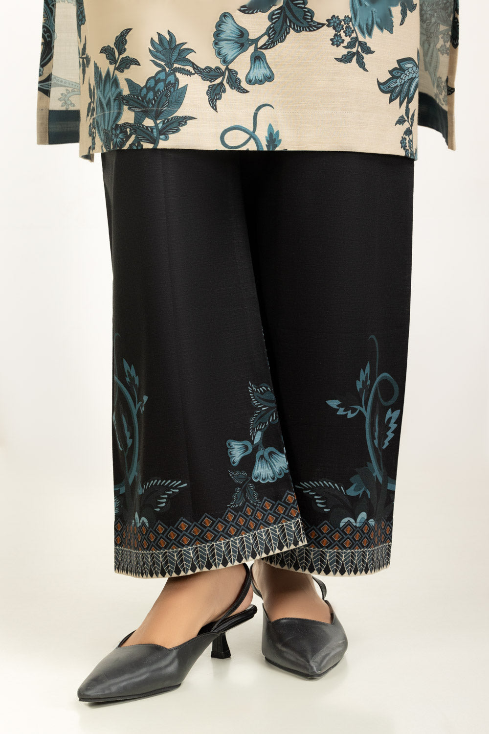Details: Printed suit featuring Round -Neckline and delicate Lacework on Sleeves.