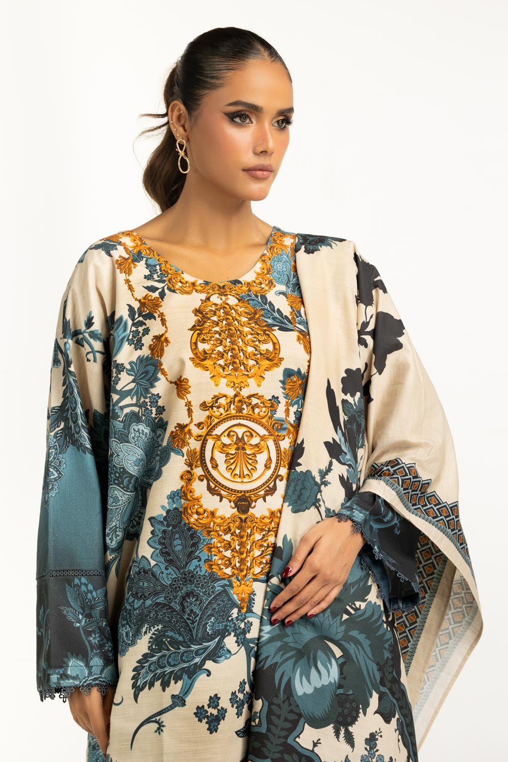 A breezy take on winter wear, this trendy off-white khaddar suit offers comfort with a modern touch. The relaxed cut and soft hand-feel make it ideal for daily wear, while its contemporary print brings a fresh update to classic winter tones.