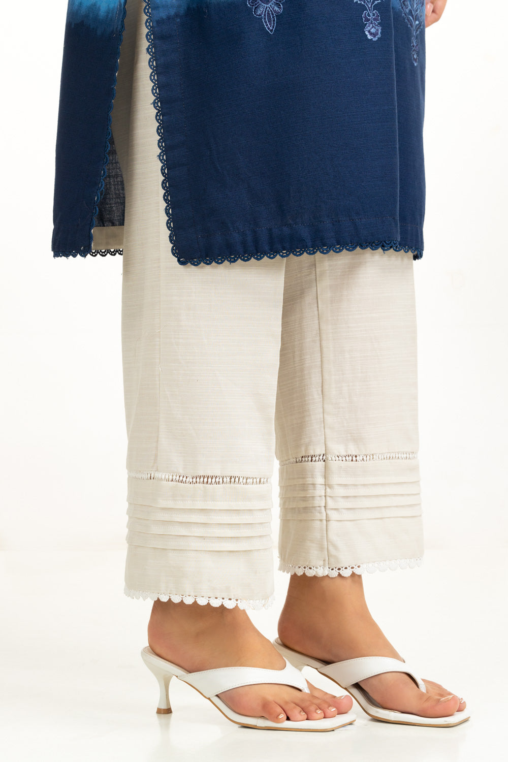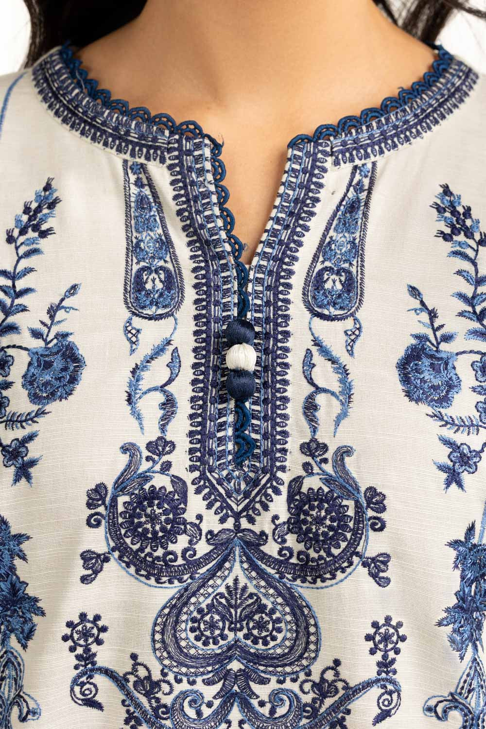 Details: Printed suit featuring Split-Neckline with delicate Lacework and Tassels.