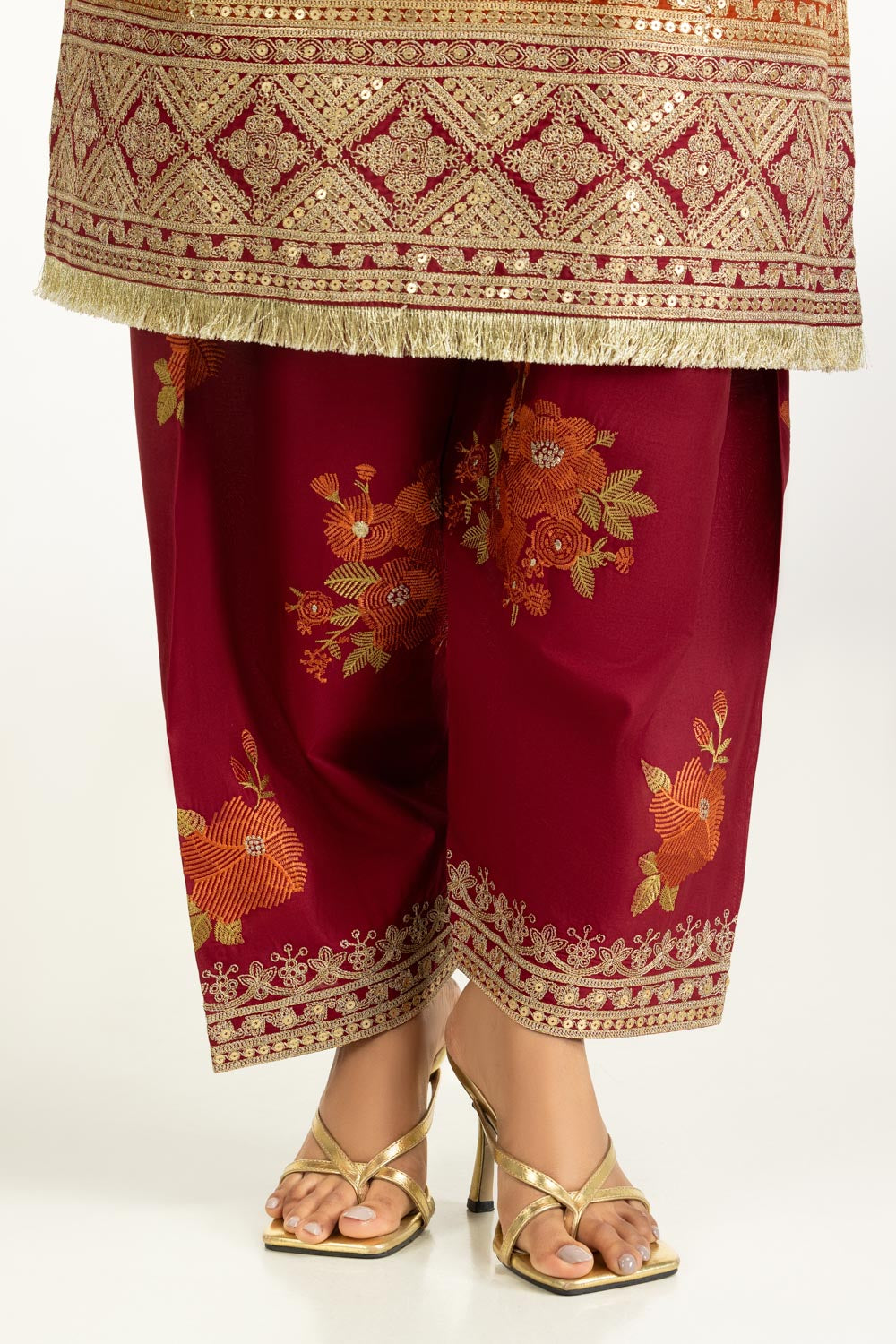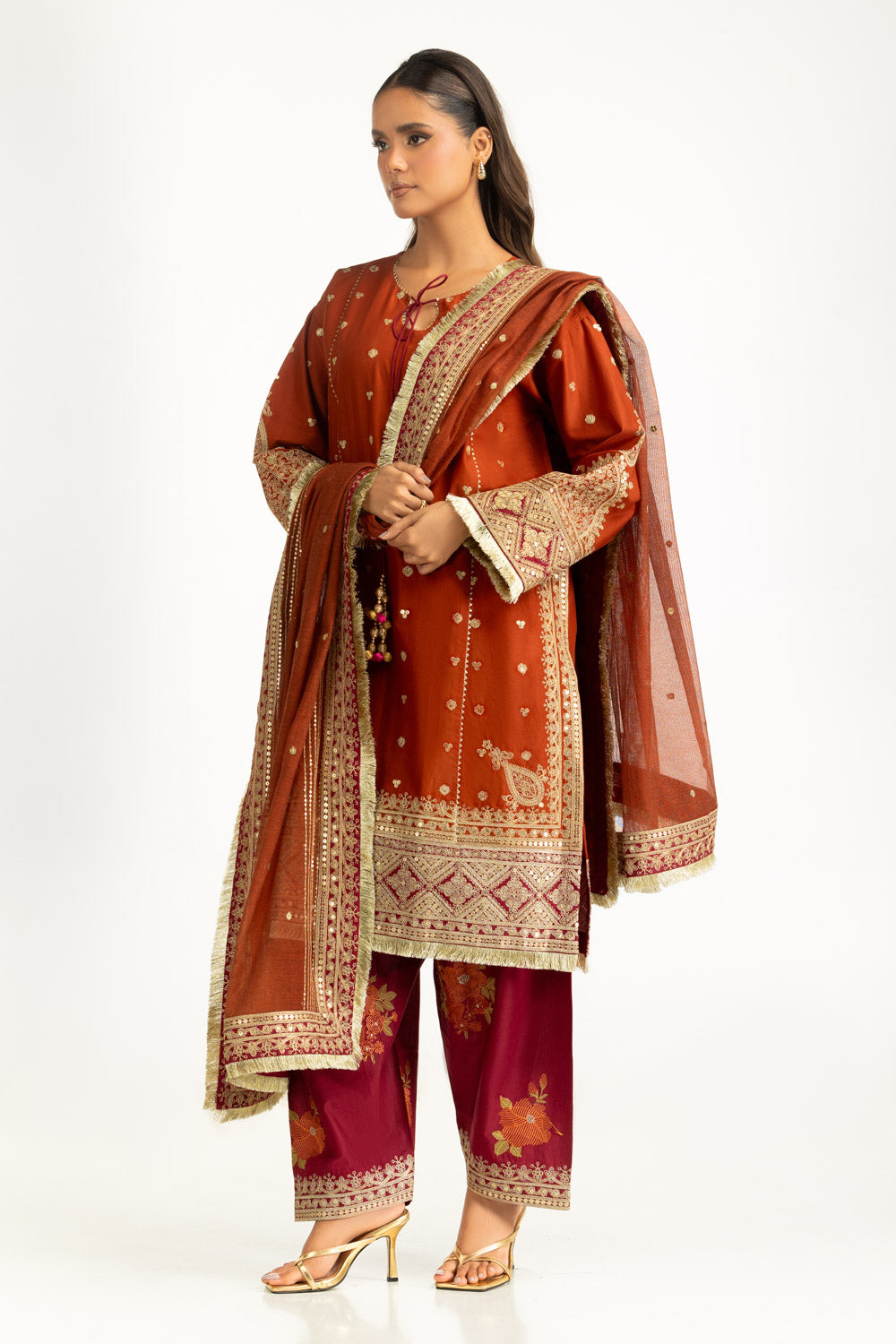 Breathable lawn fabric in a deep rust tone introduces a fresh yet light summer charm to your festive wardrobe. The embroidered shirt reflects classic appeal while staying airy and easy to wear, paired with embroidered trousers designed for lasting comfort throughout the day. Completing the look, the matching dupatta with Kiren borders offers flexible styling options and lends a refined touch for formal occasions.