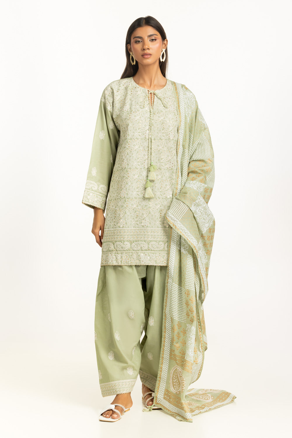 A comfort-focused outfit that allows natural movement and airflow, featuring detailed embroidery with calming color palette. Tailored in a breathable lawn fabric and loose-fit silhouette, it supports comfort during warm days, making it ideal for daytime social settings.