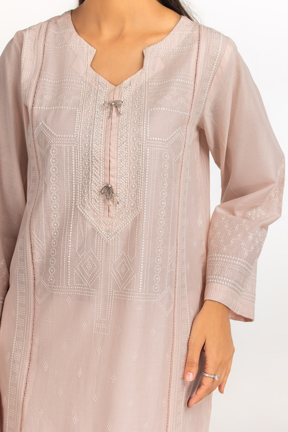 Details: Embroidered suit featuring round-neckline with delicate tassels.