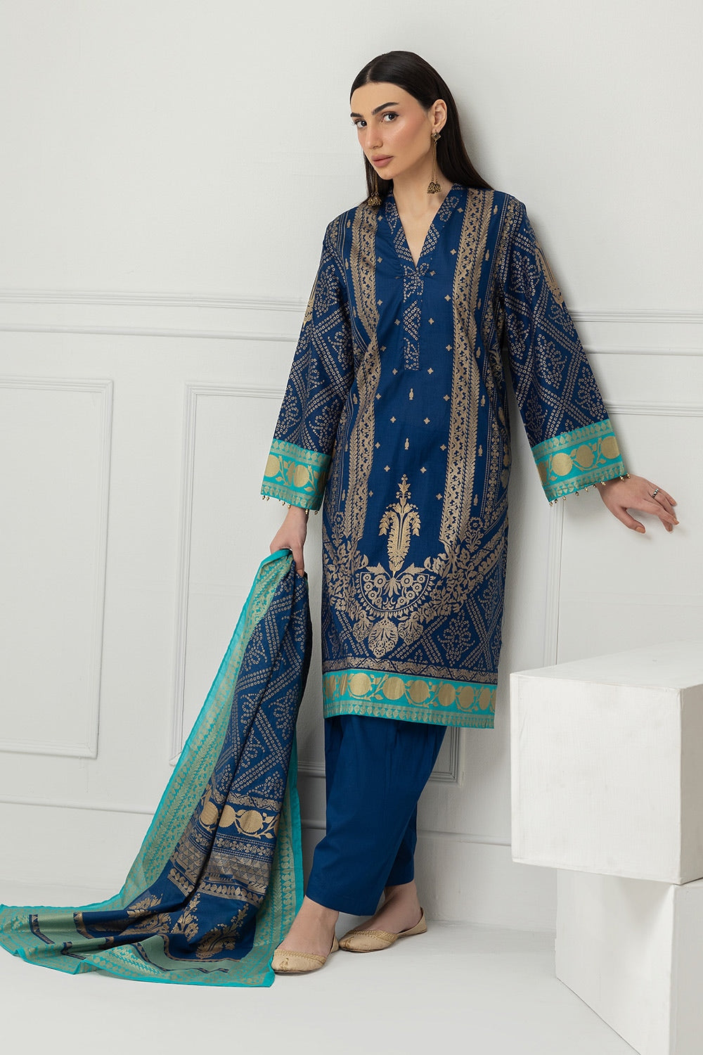 Look glamorous in this beautiful blue outfit, featuring a shimmery printed shirt and dupatta with matching trousers. The motif print adds a traditional touch, while the relaxed fit keeps it easy to wear.