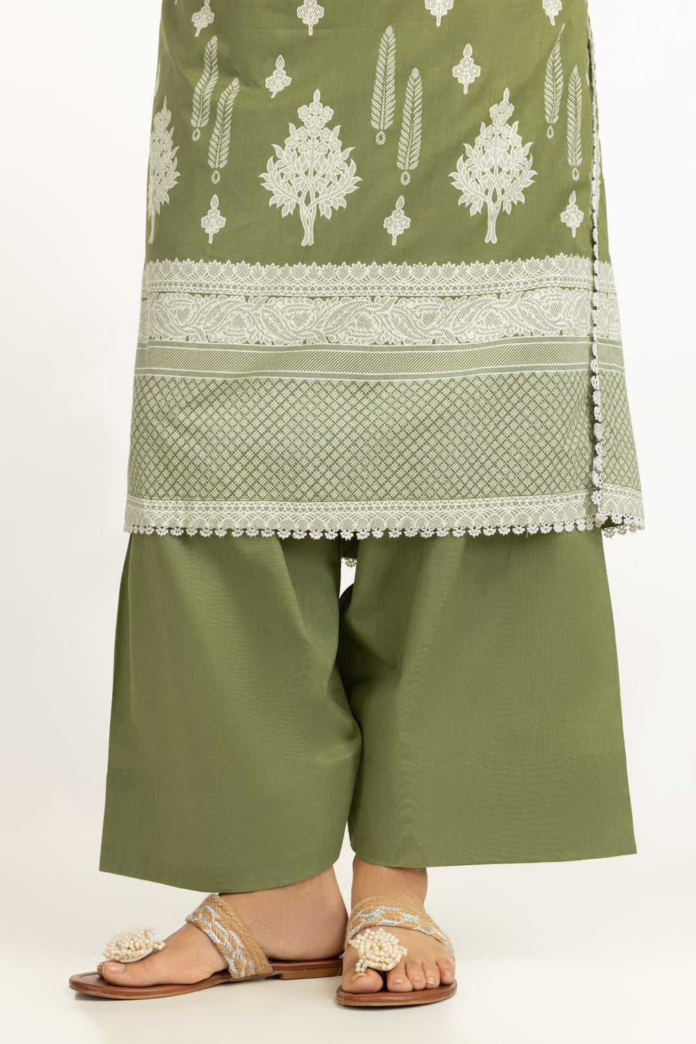 The airy lawn fabric and loose structure make this green suit easy to wear, all day long. Its lacquer print brings visual interest while remaining season-appropriate. Paired with a plain dyed trouser that ensures comfort with simplicity.