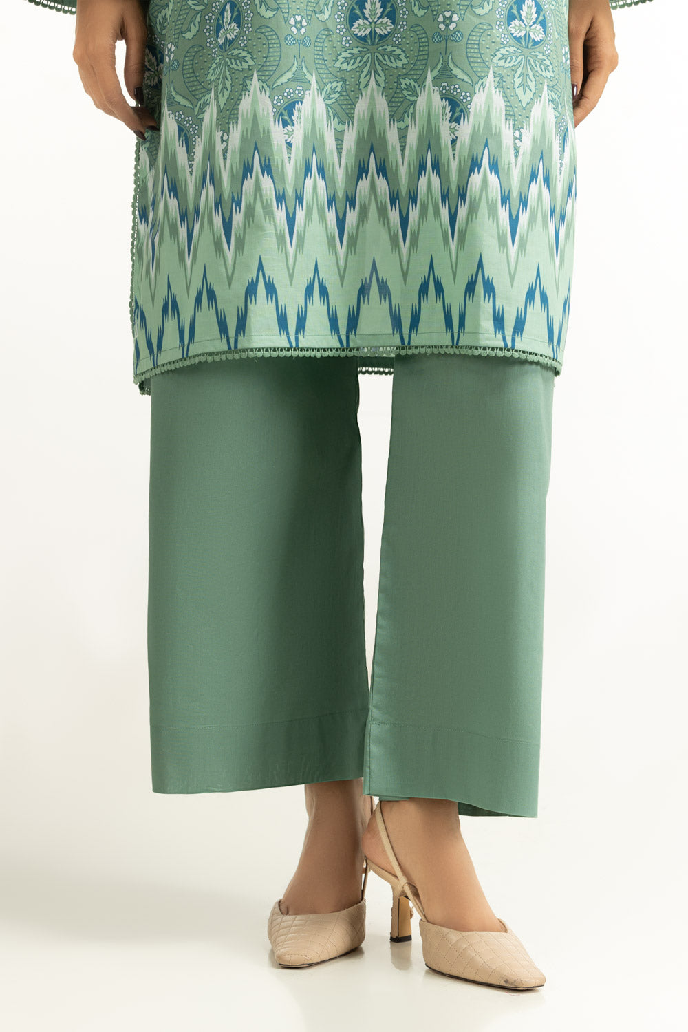 Featuring a refreshing green palette, this printed lawn suit feels light on the skin and easy to carry throughout the day. The relaxed fit ensures airflow, making it suitable for extended wear in summer heat. Paired with a plain dyed trouser that adds balance to the overall look.