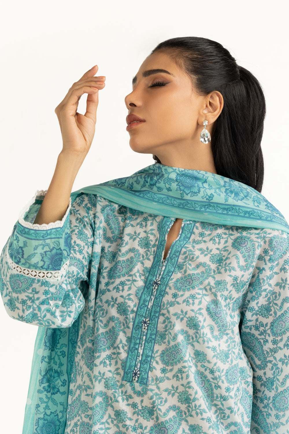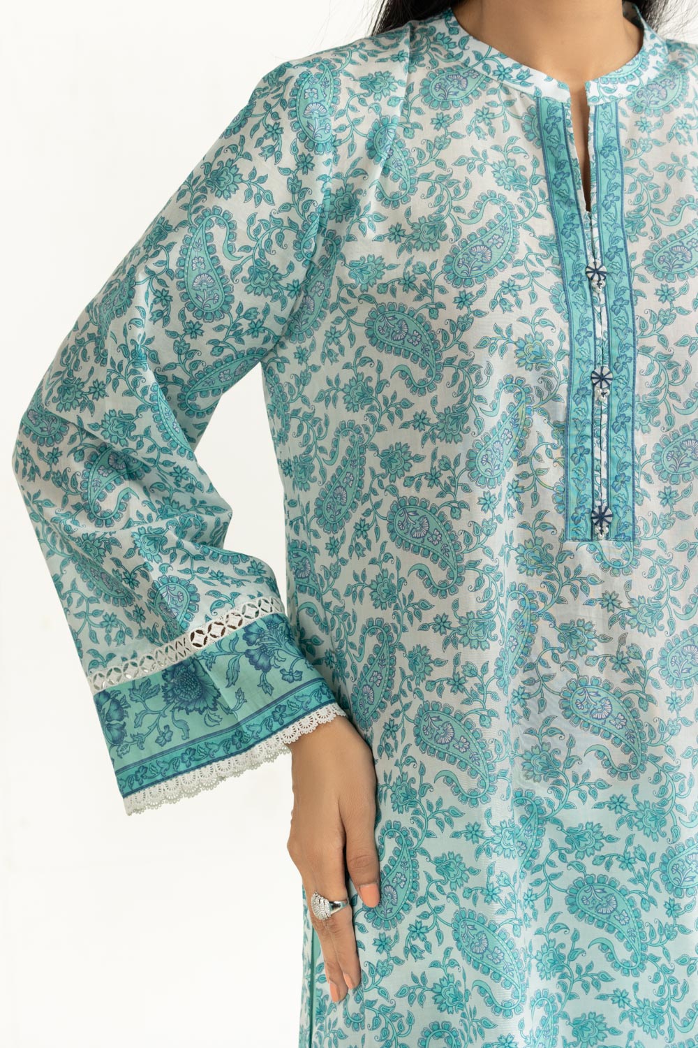 With its refreshing sea green hue and contemporary print, this lawn outfit suits everyday summer gathering. The airy cut allows ease of movement all day long. Paired with a plain dyed trouser, it stays super light and functional.