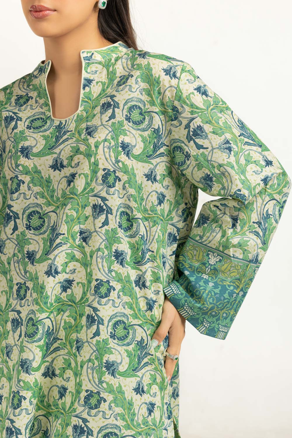This contemporary printed lawn suit is designed to stay comfortable through long summer days. The breathable lawn fabric feels soft against the skin, while the loose fit allows steady airflow and relaxed movement. Balanced with a plain dyed trouser, the outfit remains easy to manage and suitable for casual gatherings or relaxed lunch plans.
