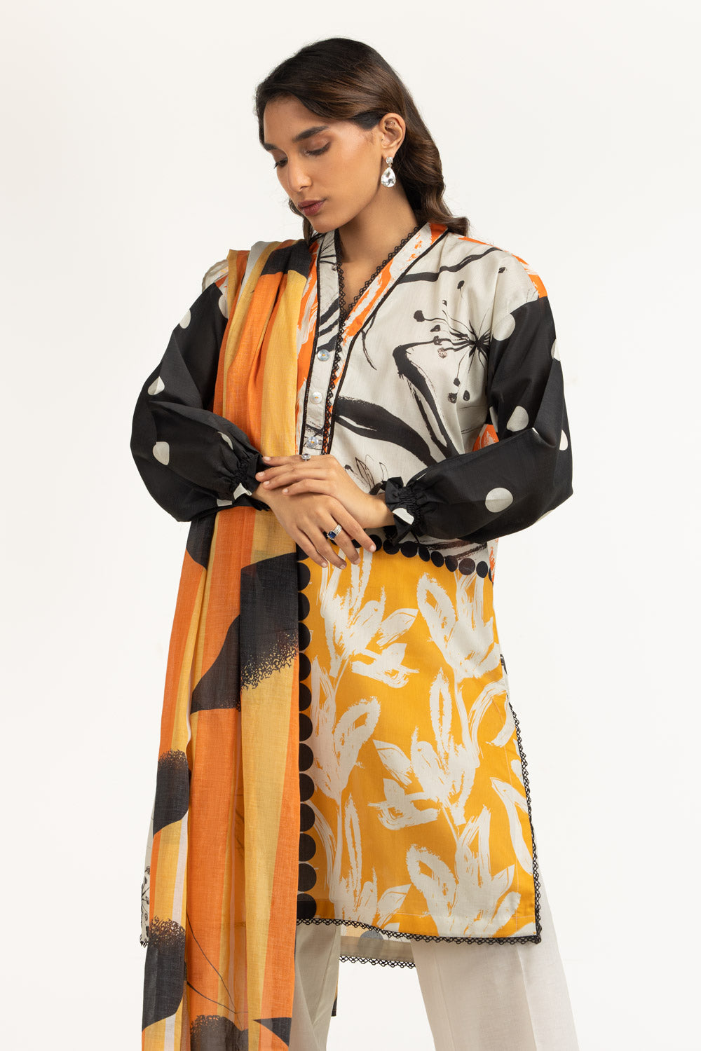 Focused on breathability and ease, this lawn suit remains comfortable even during long wear. The multi-toned print adds visual variety without overwhelming the look. A functional option casual summer gatherings.