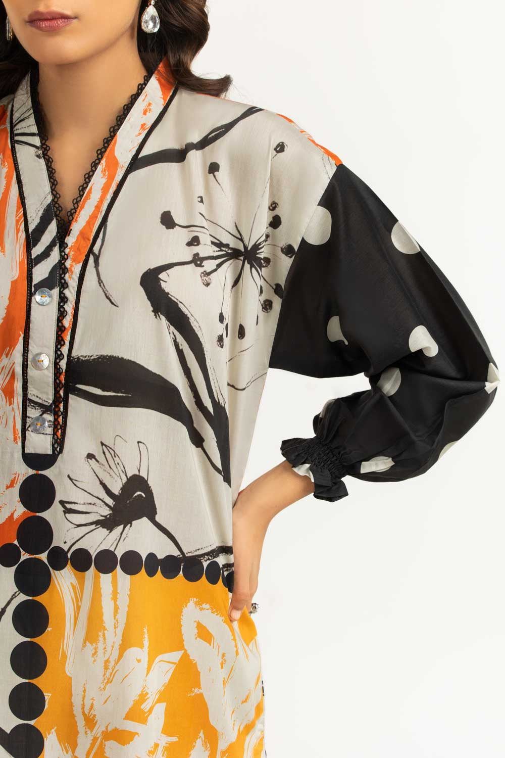 Details: Printed suit featuring v-neckline with delicate lacework and balloon sleeves.