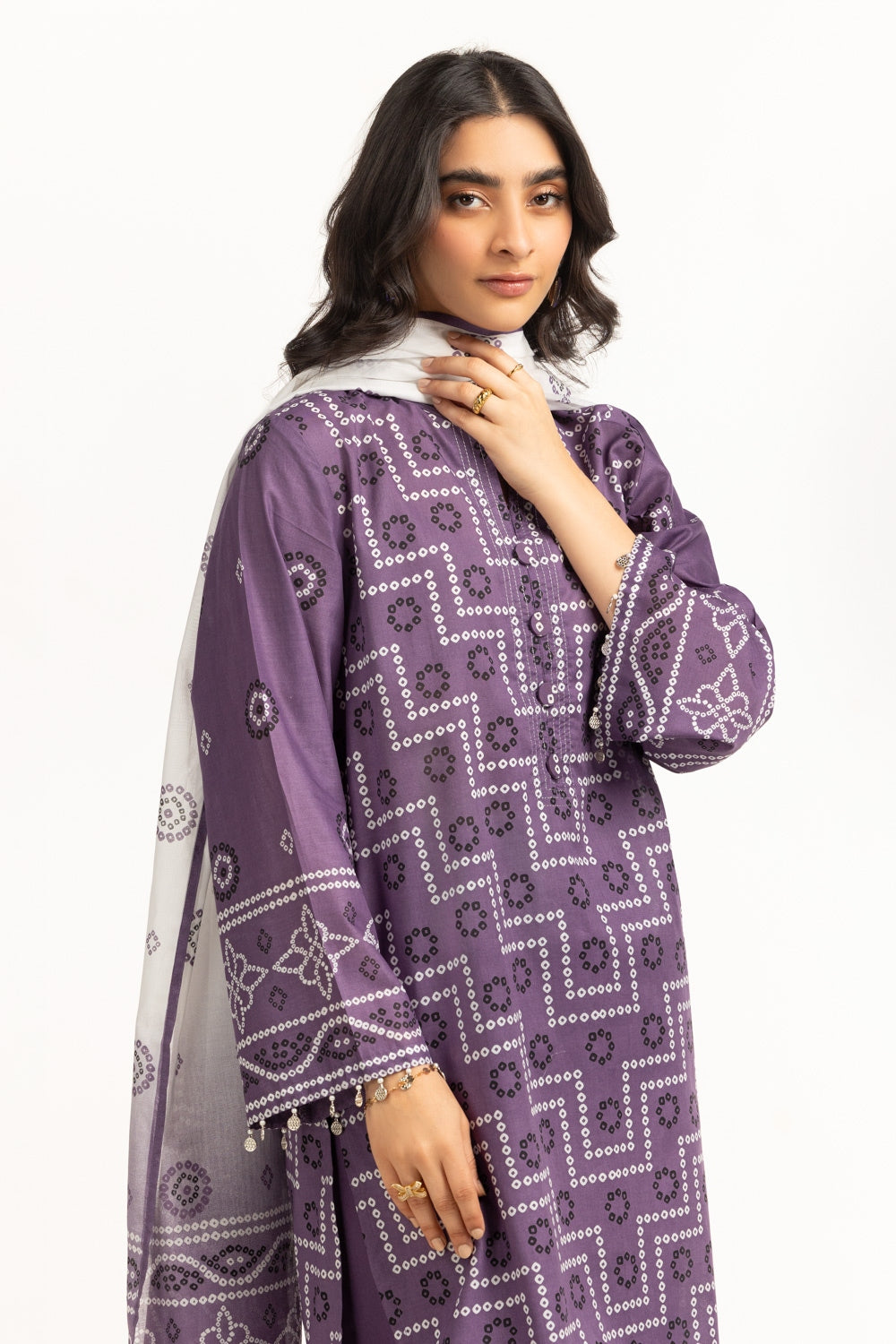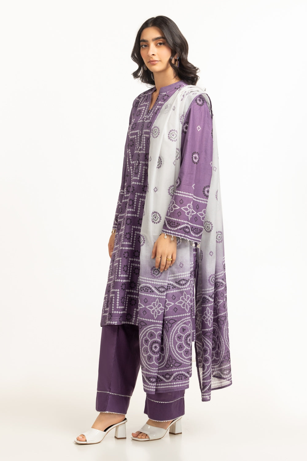 Tailored for warm summer days, this breezy lawn outfit features a printed shirt and dupatta, matched with dyed trousers tailored in a relaxed with silhouette, offering a chic look throughout the day.