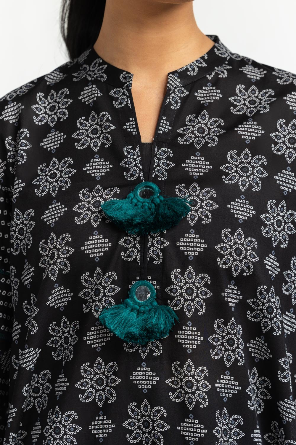 Details: Printed Shirt with a V-Neckline with Tassels.