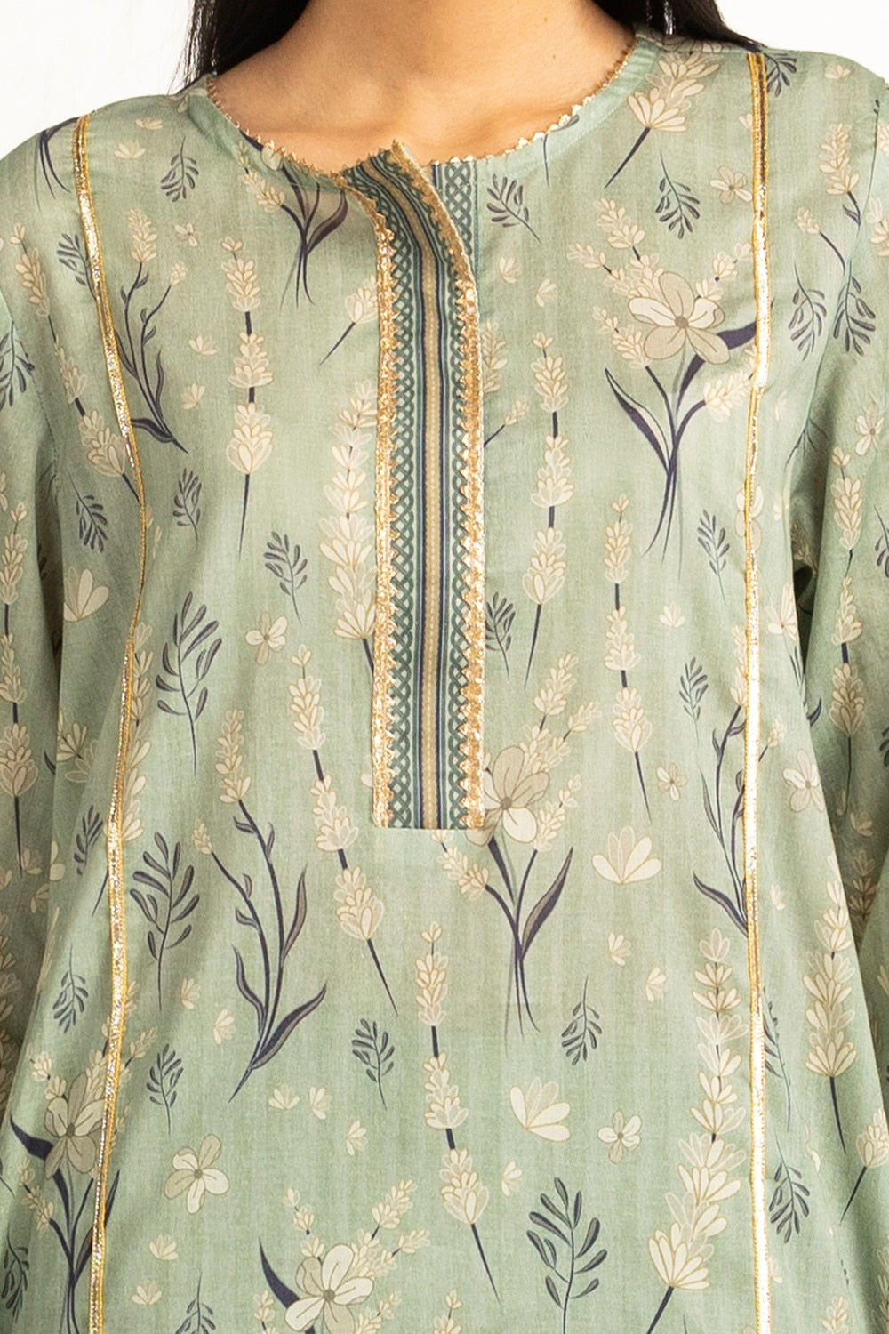 Details: Printed lawn suit featuring a Round-Neckline with delicate Lacework