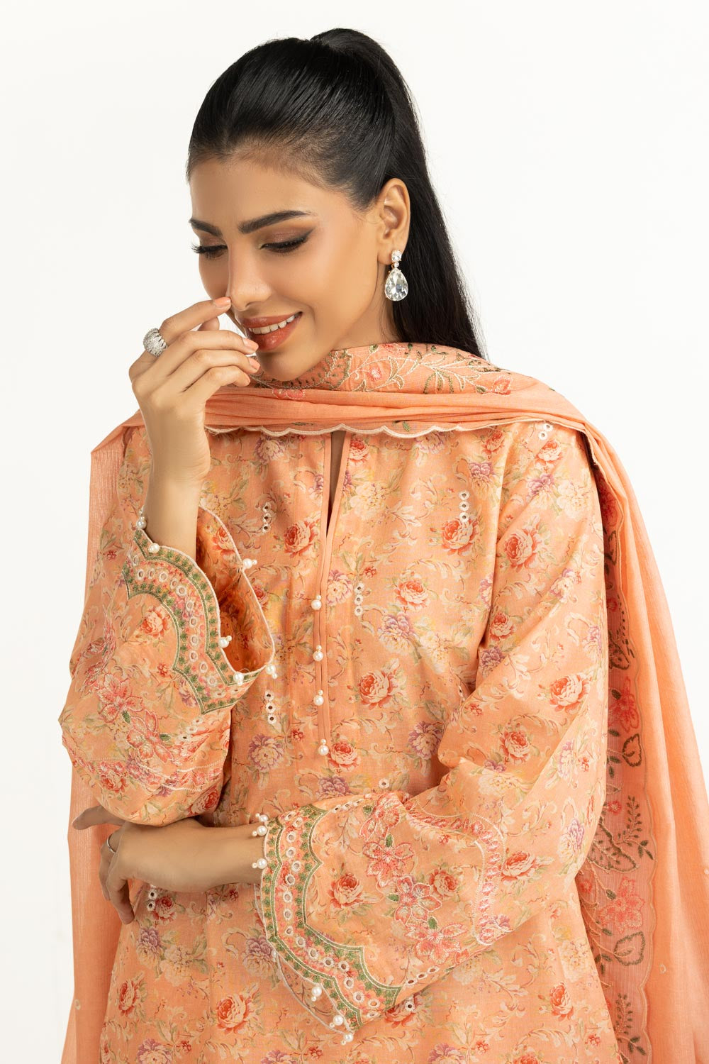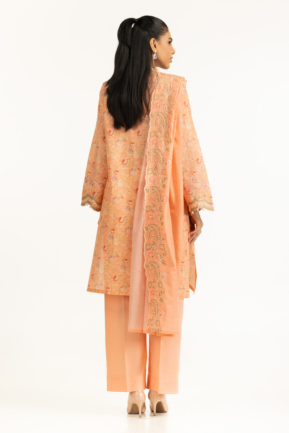 This 3-piece lawn suit in a soft peach hue, delivers a soft summer aesthetic with breathable fabric and a loose fit that supports breezy comfort during long hours, while the floral embroidery adds subtle details for daytime casual gatherings.