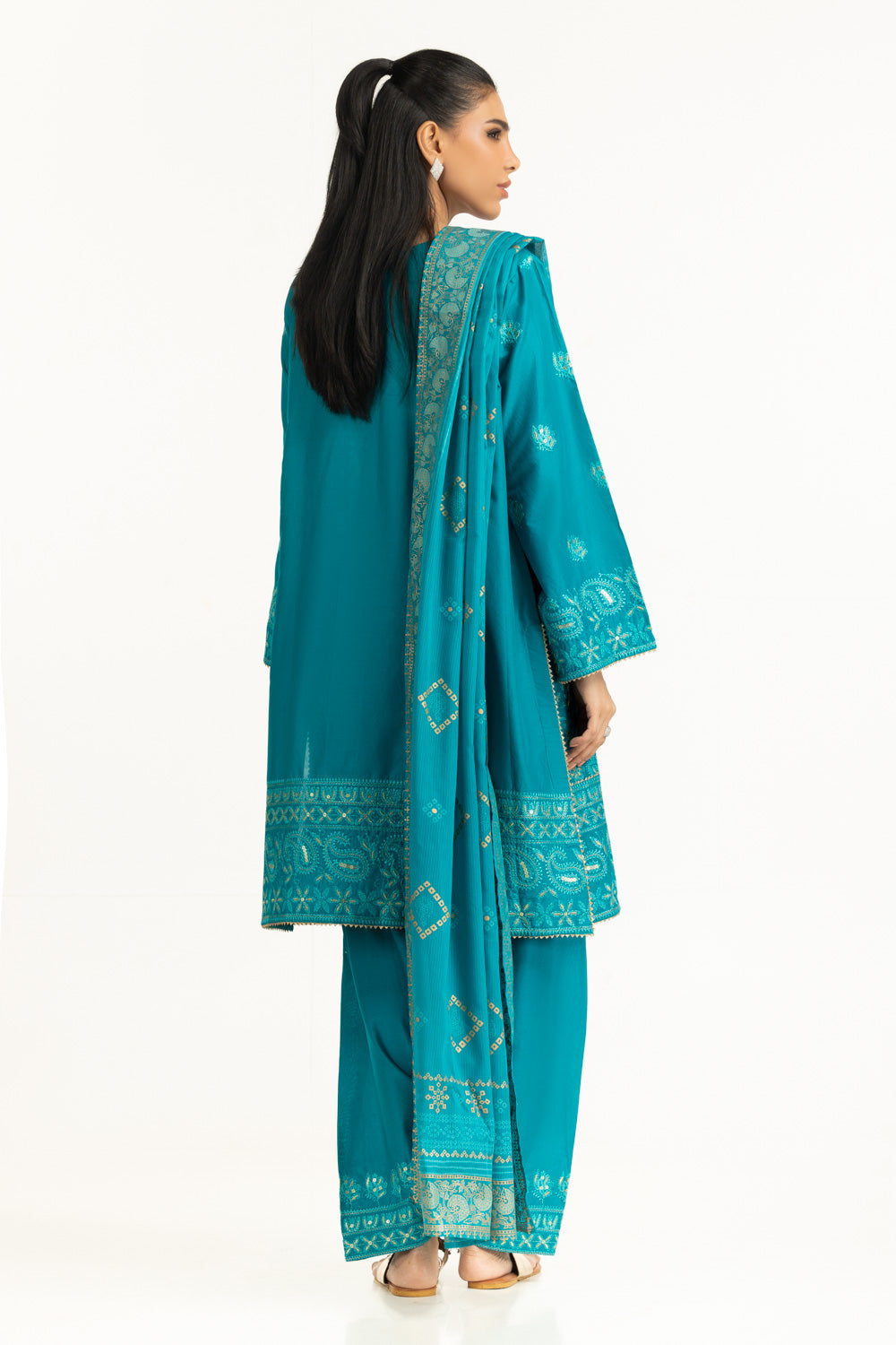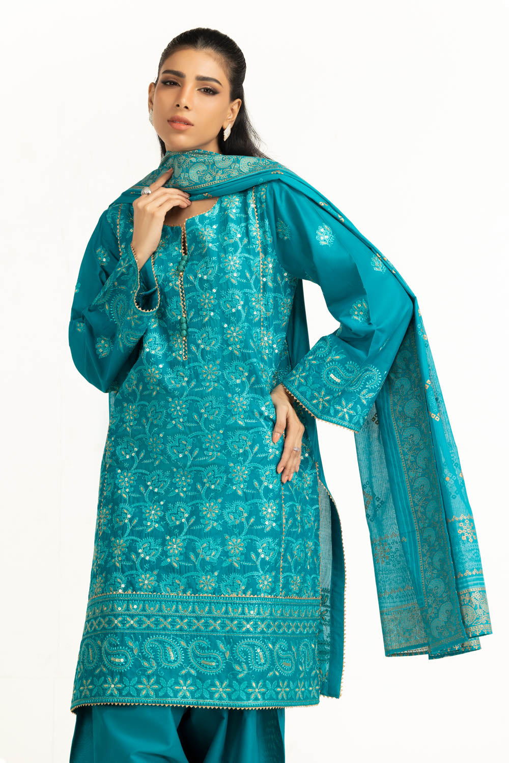 Details: Embroidered suit featuring a rounded split-neckline and gota lace.