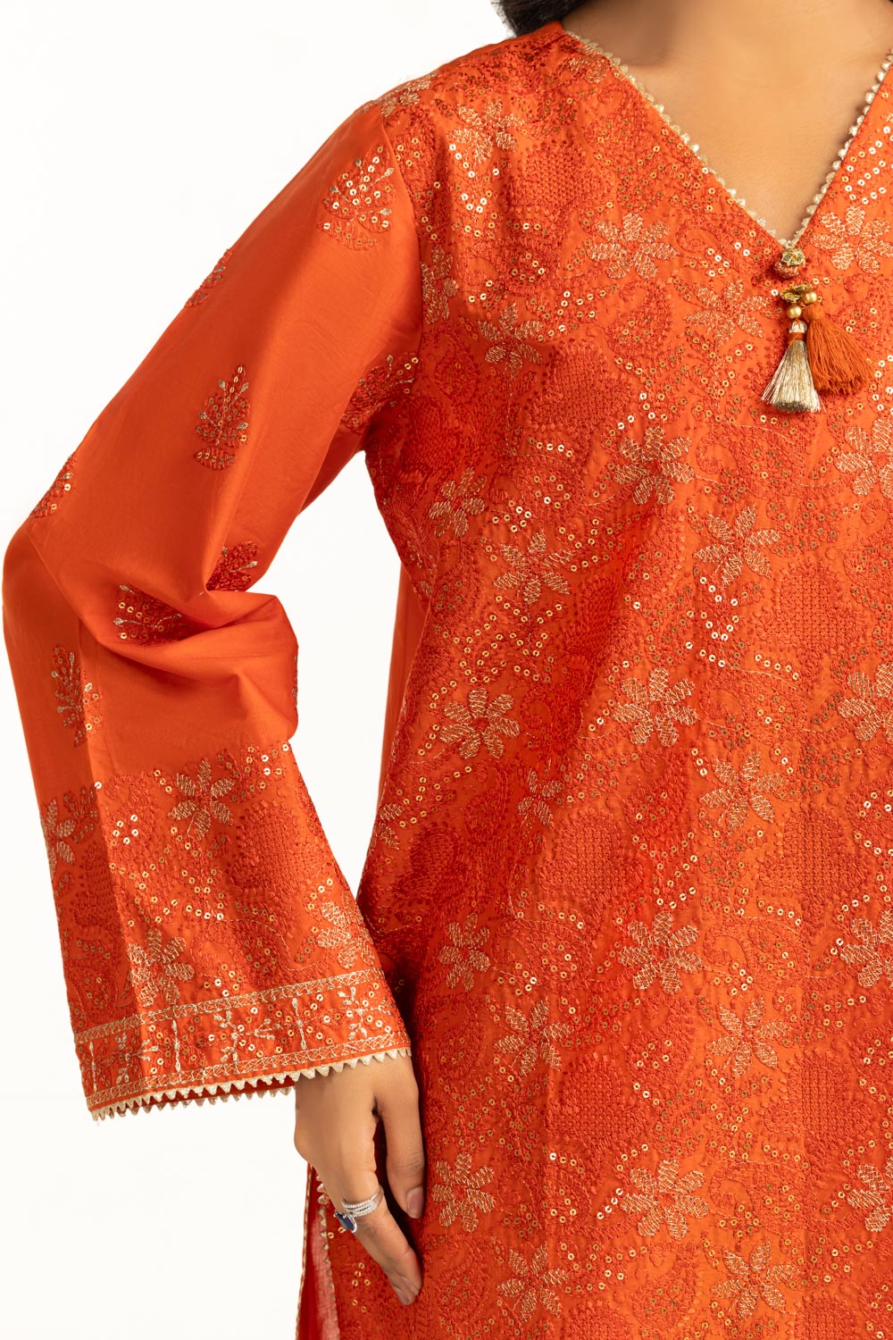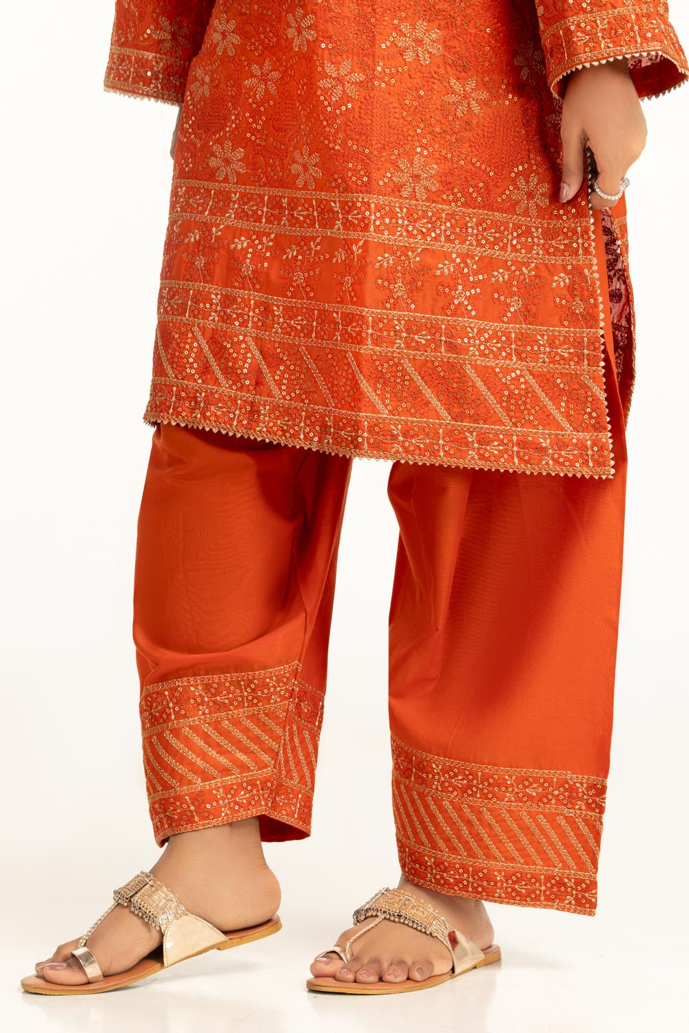 With its vibrant tone and comfortable construction, this outfit balances visual energy with functionality, allowing ease of wear through loose tailoring and breathable fabric, while the light sequence work maintains a composed look without adding weight.