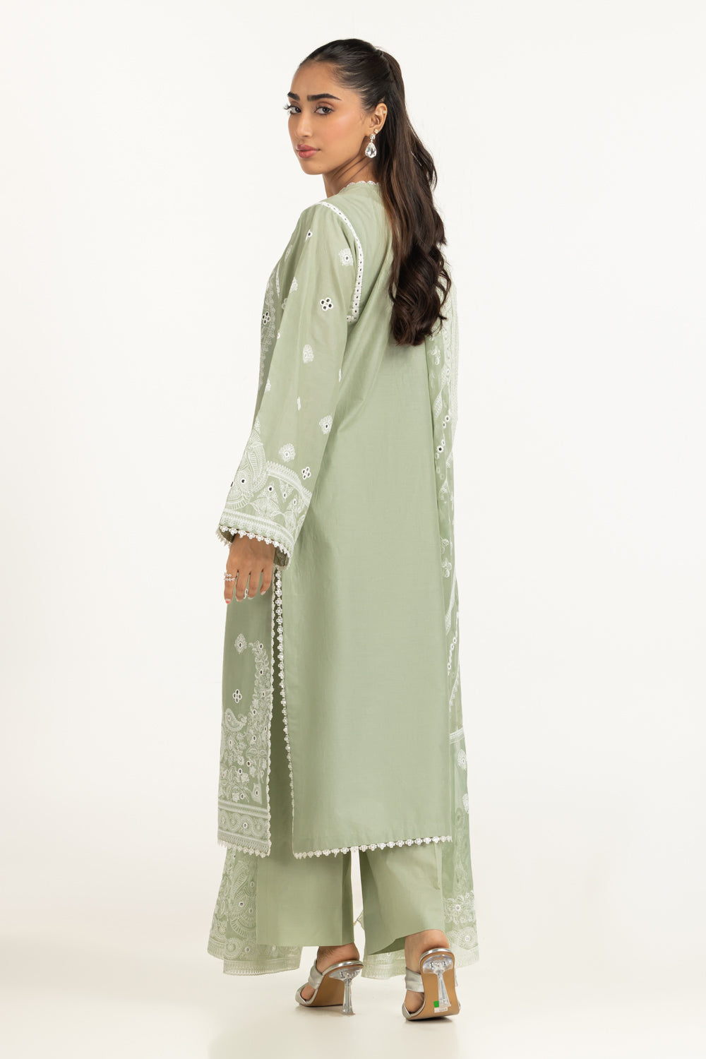 Details: Embroidered suit featuring v-neckline with delicate lacework dori tassels.