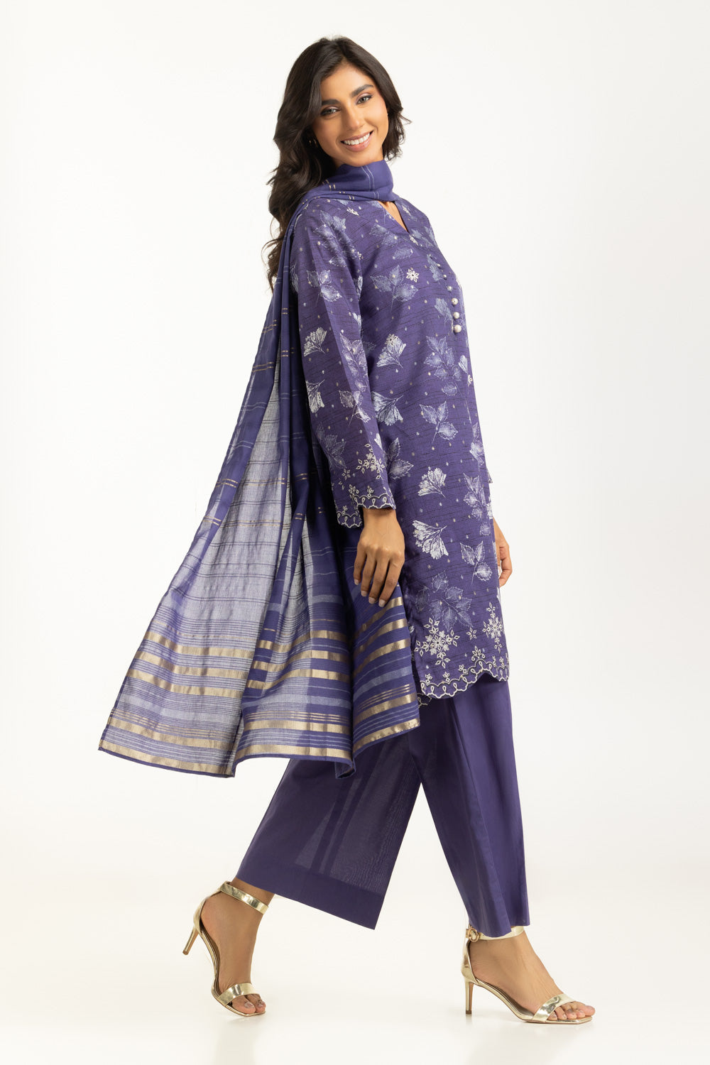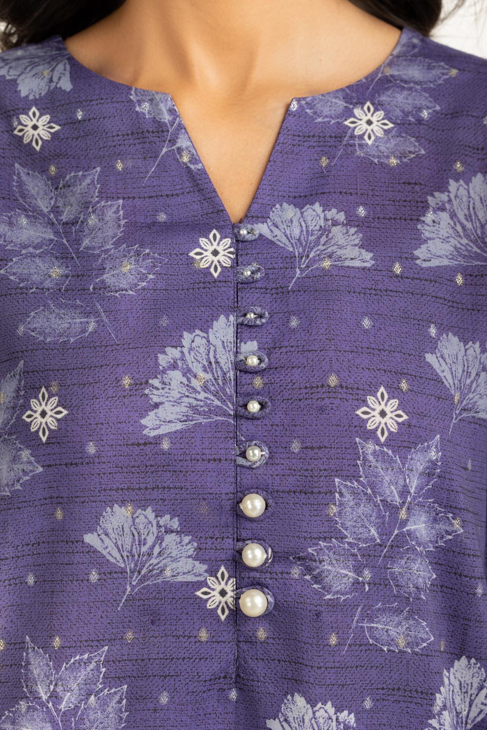 Details: Printed suit featuring V-Neckline and delicate Pearls.