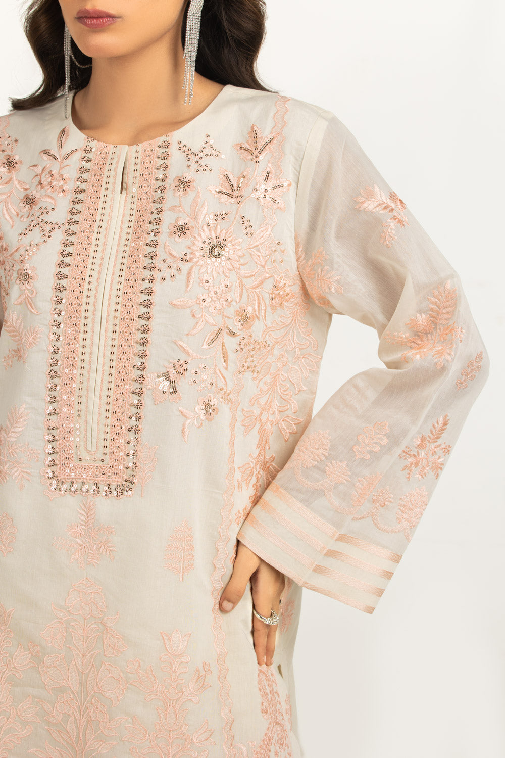 Details: Embroidered suit featuring round-neckline.
