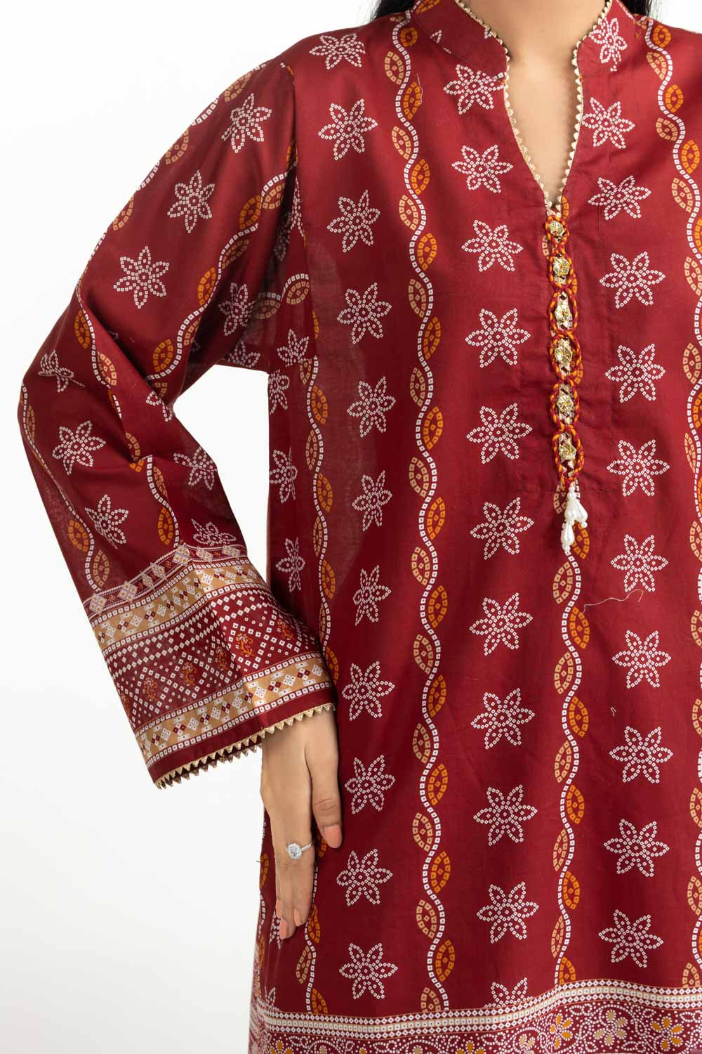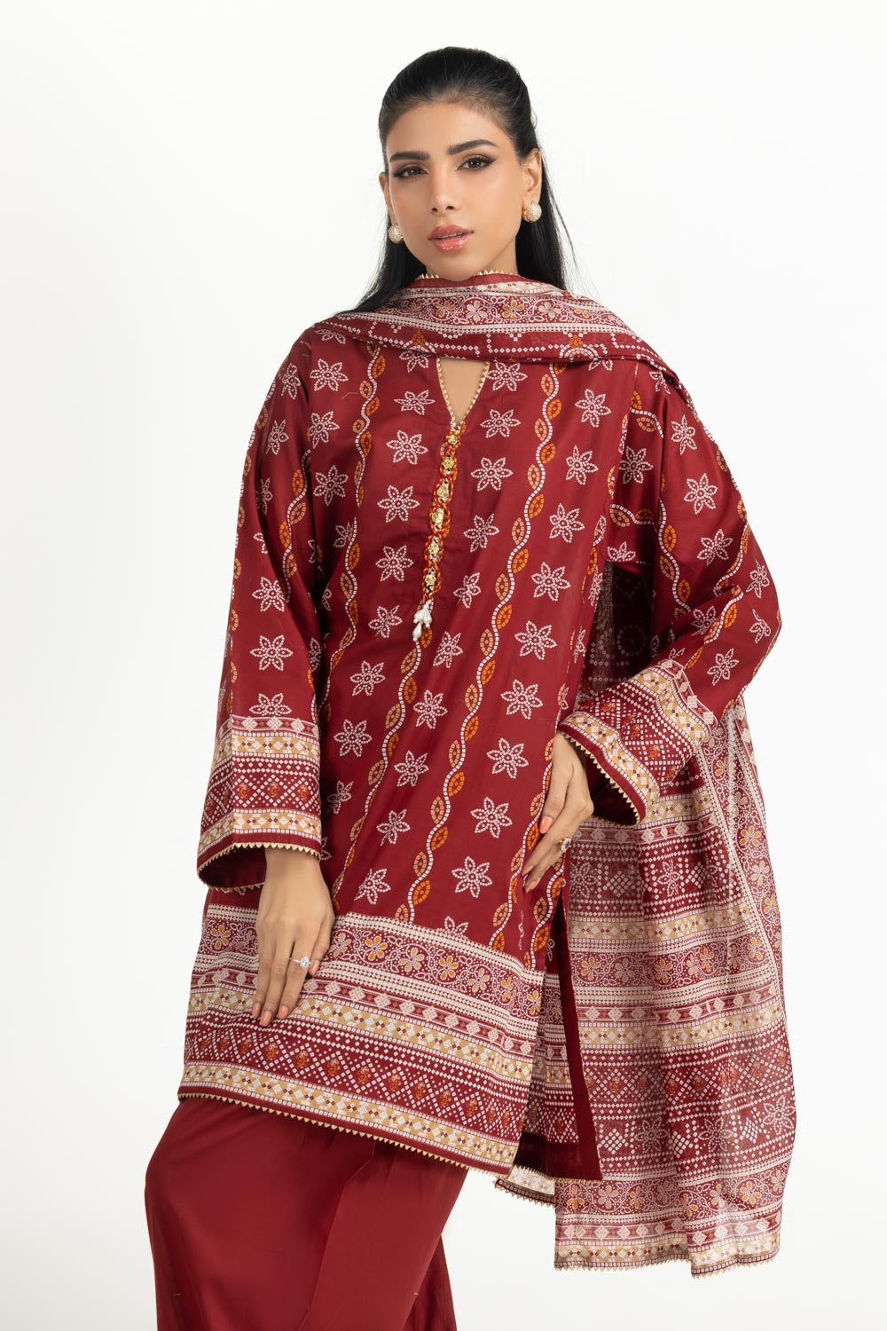 Deep maroon hue creates a rich summer statement in this 3-piece lawn suit. The lightweight lawn fabric and flowing contemproary print offer effortless comfort while adding a trendy ethnic touch. Paired with a plain dyed shalwar, this set is perfect for casual gatherings and friendly get-togethers.