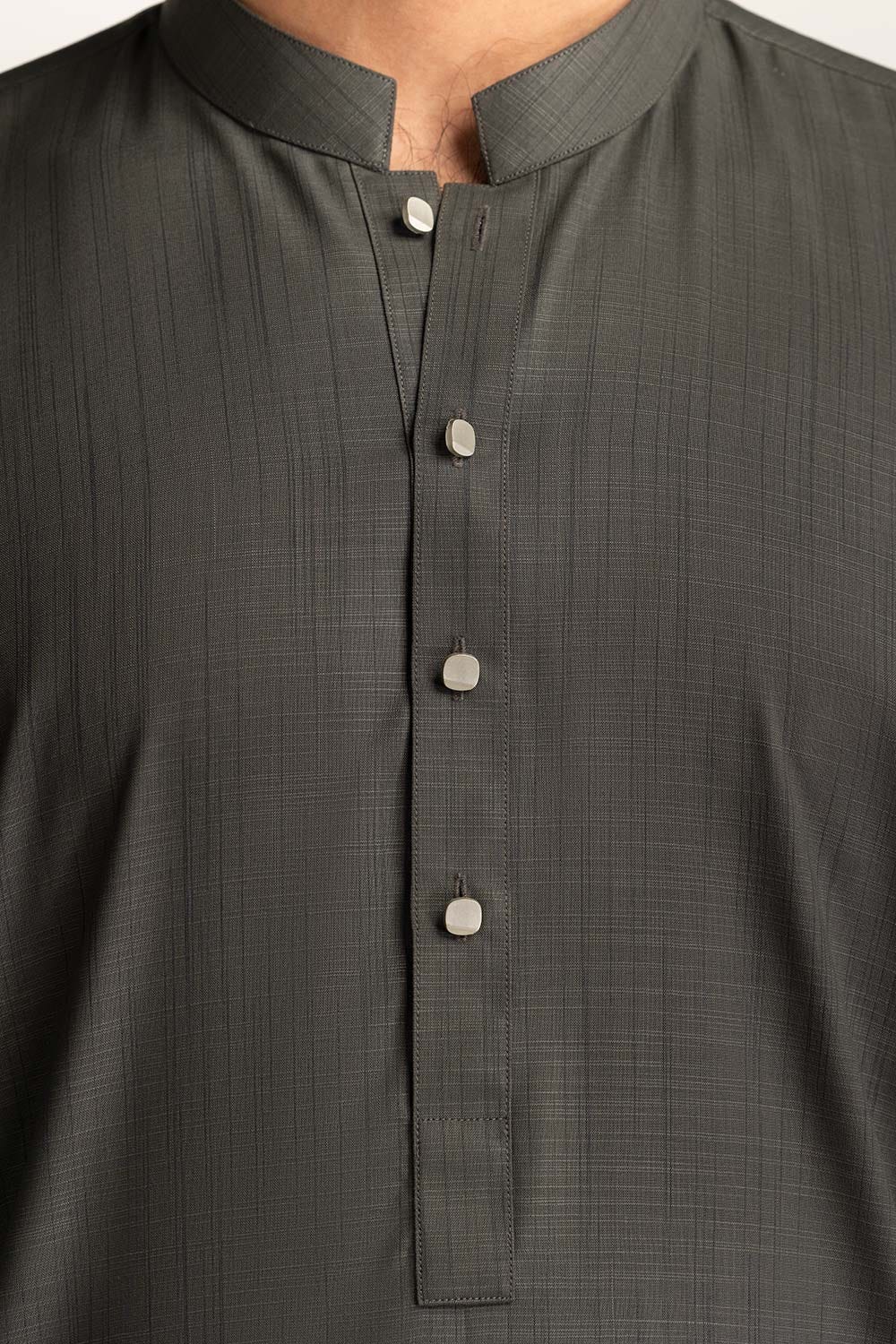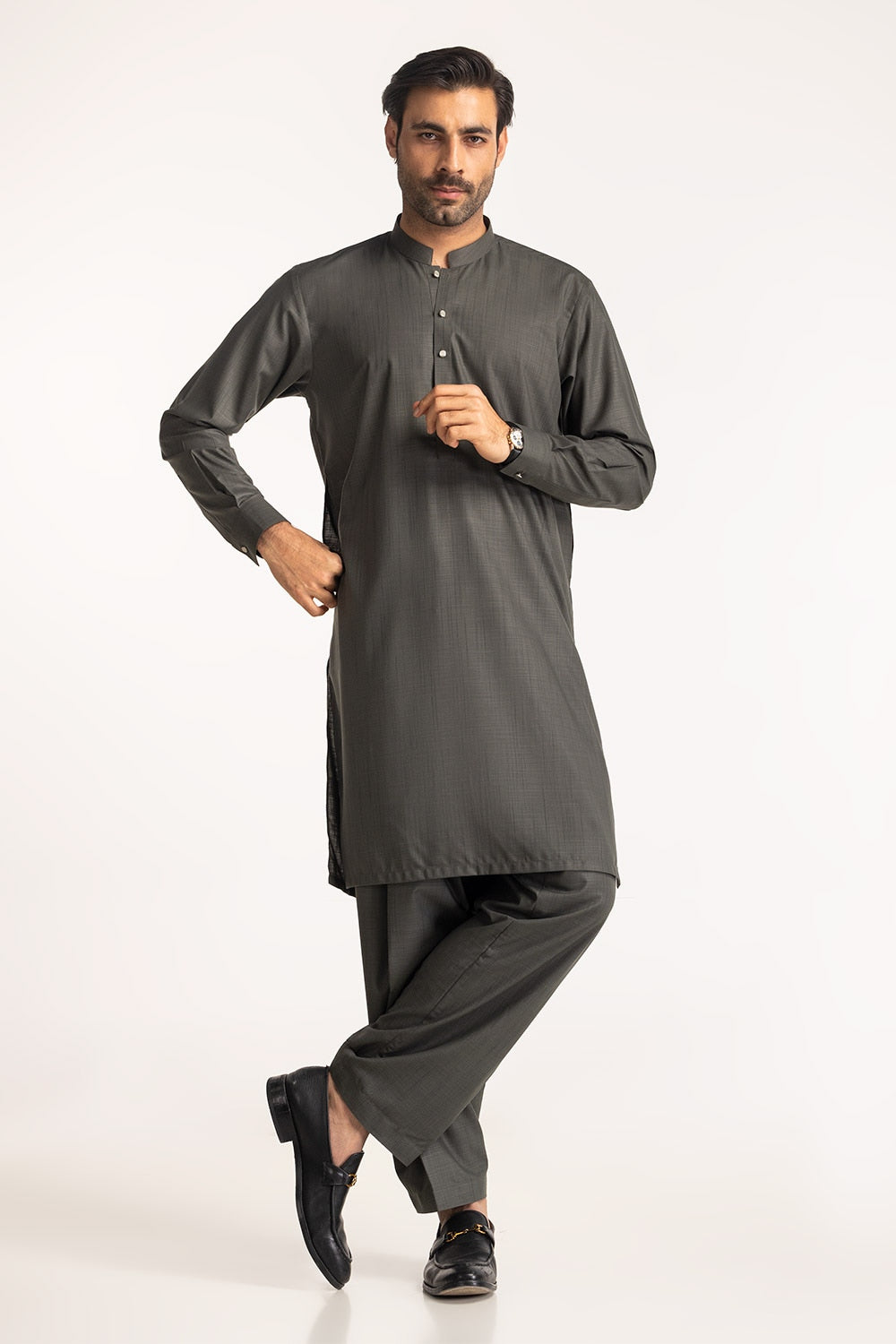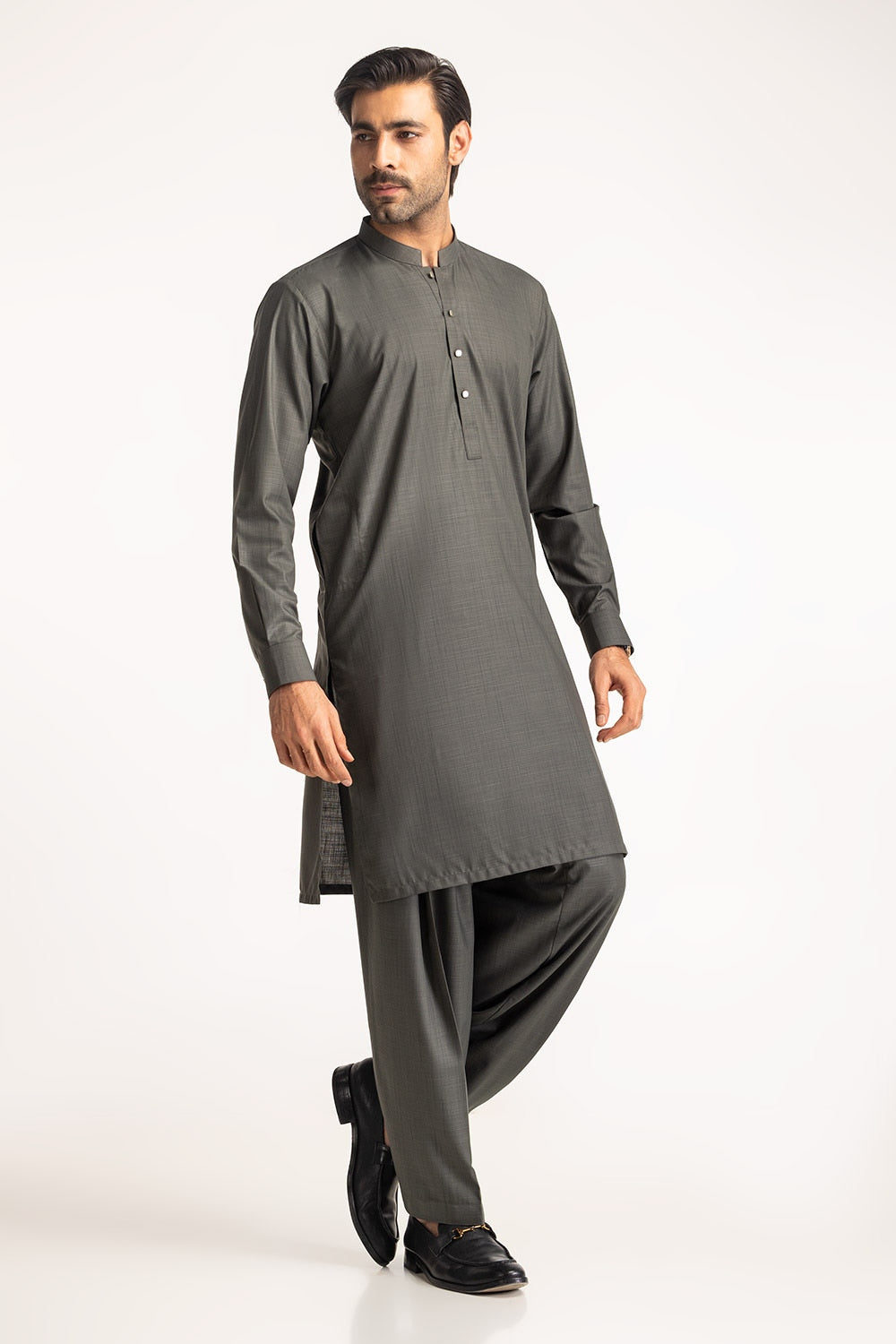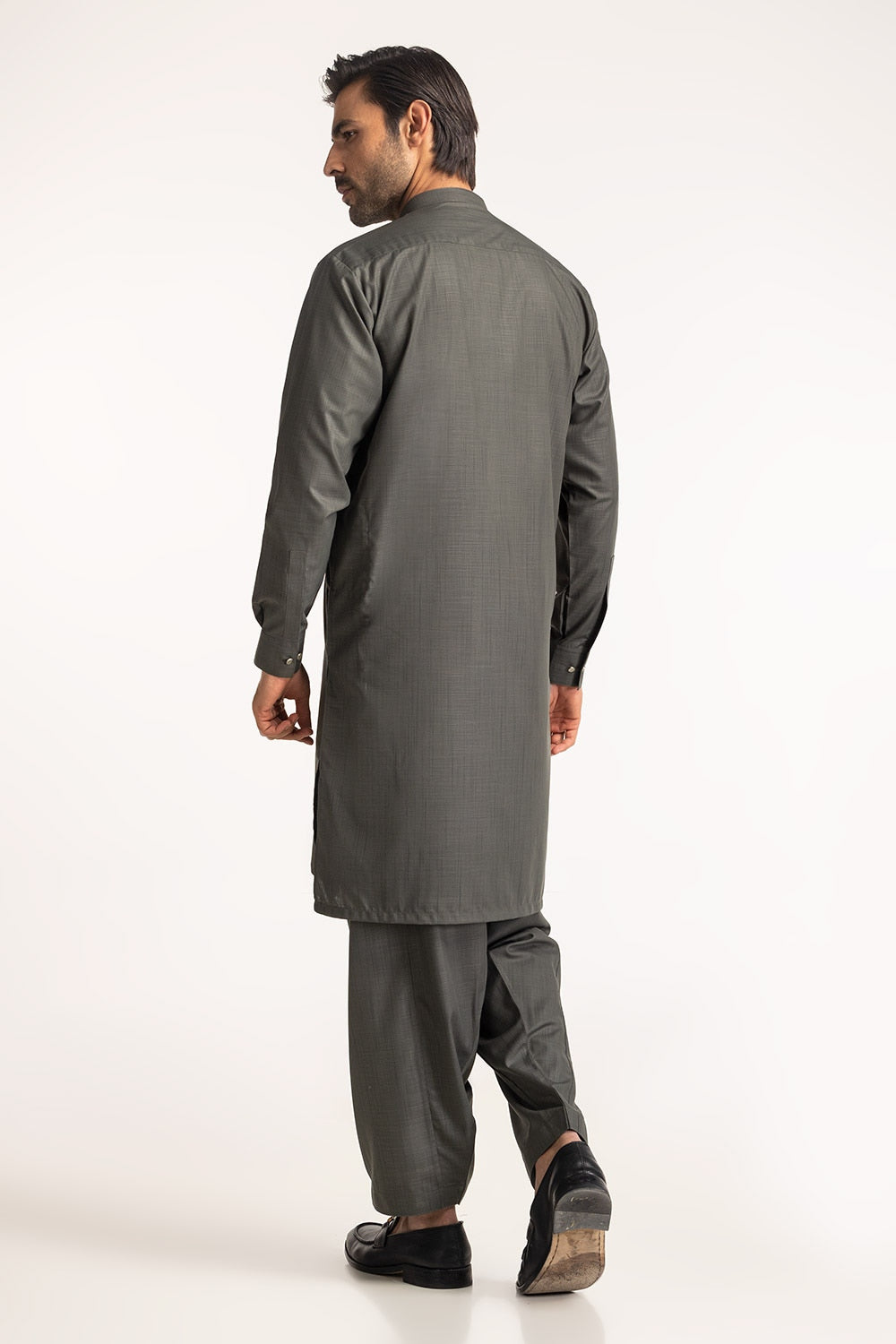 Crafted with simplicity and elegance, this Dark green Blended Casual Kameez Shalwar features a Sherwani collar and straight hem, effortlessly blending traditional aesthetics with modern sensibilities to create a timeless and versatile garment