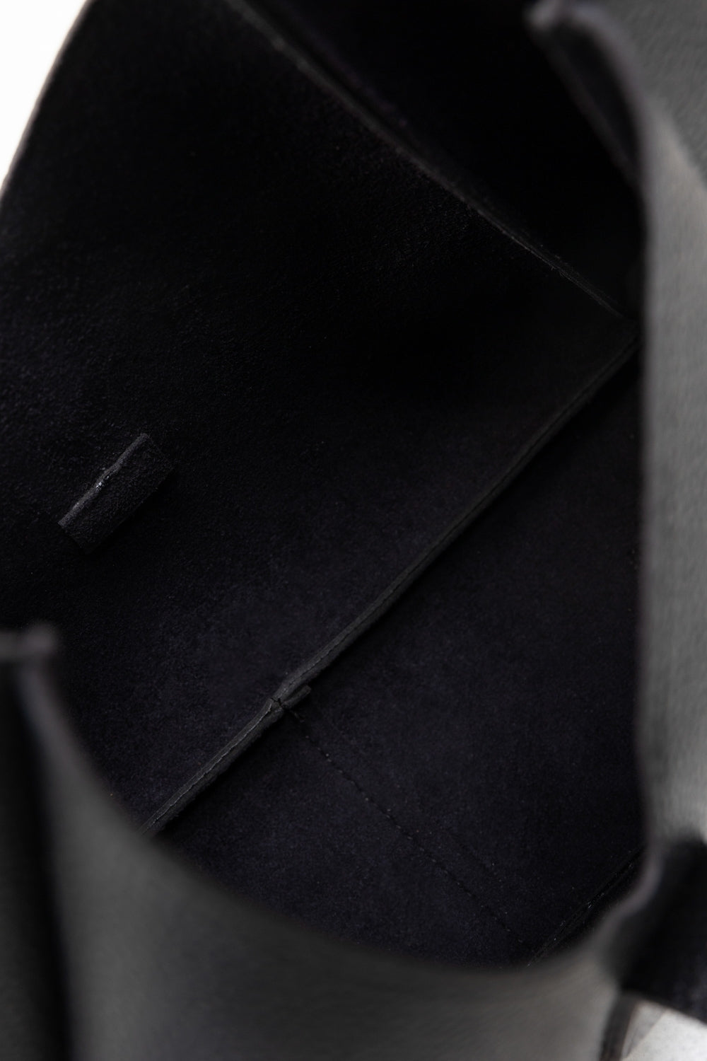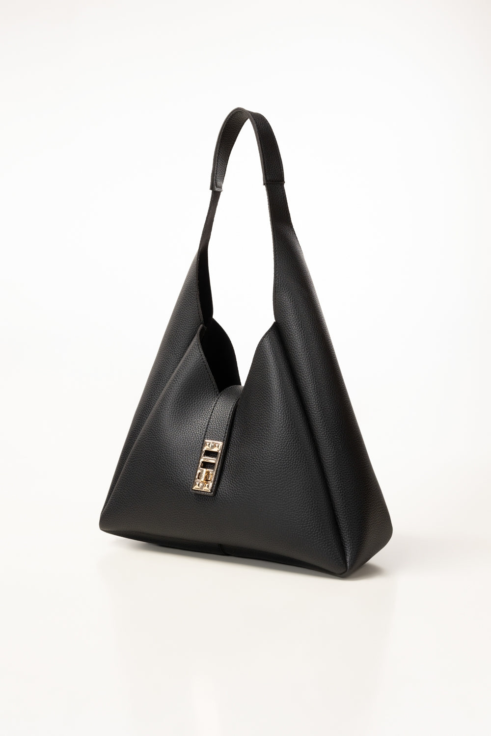 Black textured faux leather shoulder bag with inner pouch. Crafted from pebbled faux leather, it features a soft, slouchy silhouette with a modern edge. The bag secures with a front flap and a gold-tone twist-lock closure, adding a refined detail to the minimalist design.