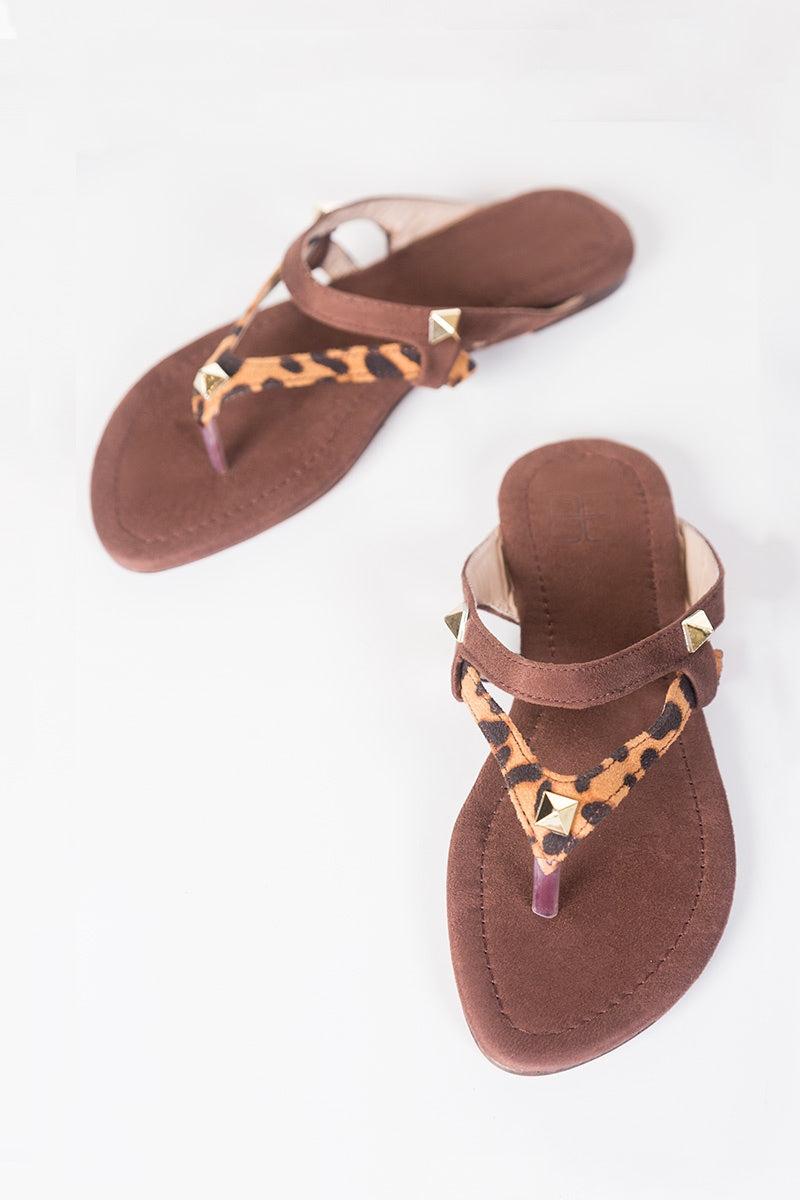 Fancy, comfortable brown flats in satin fabric, with cheetah print and dull-gold studs