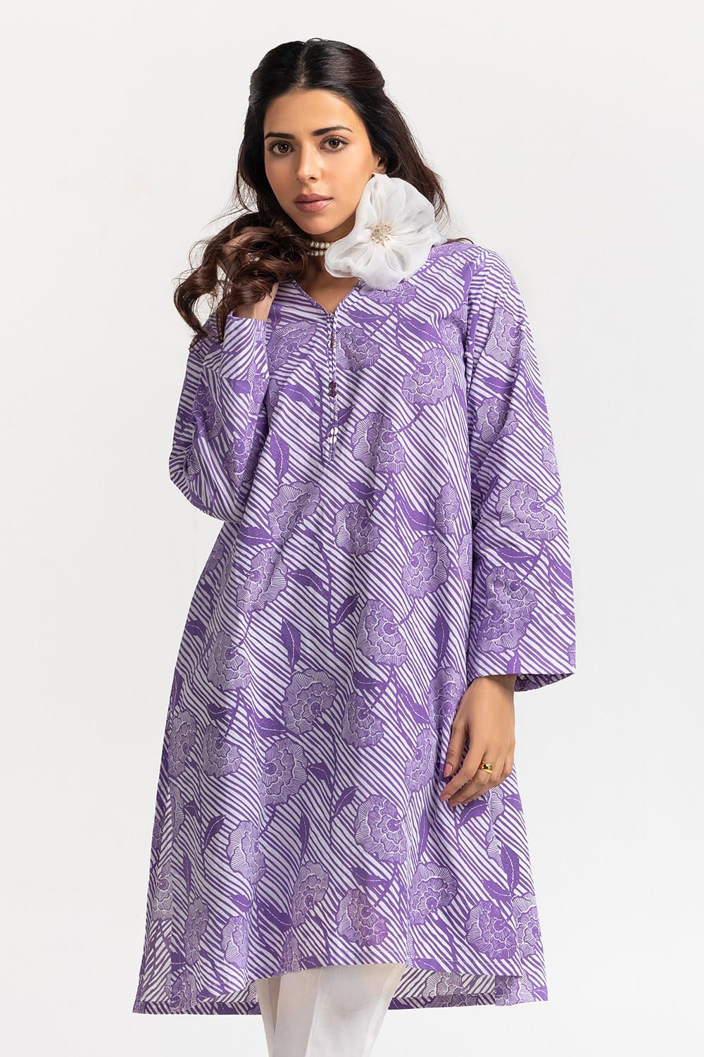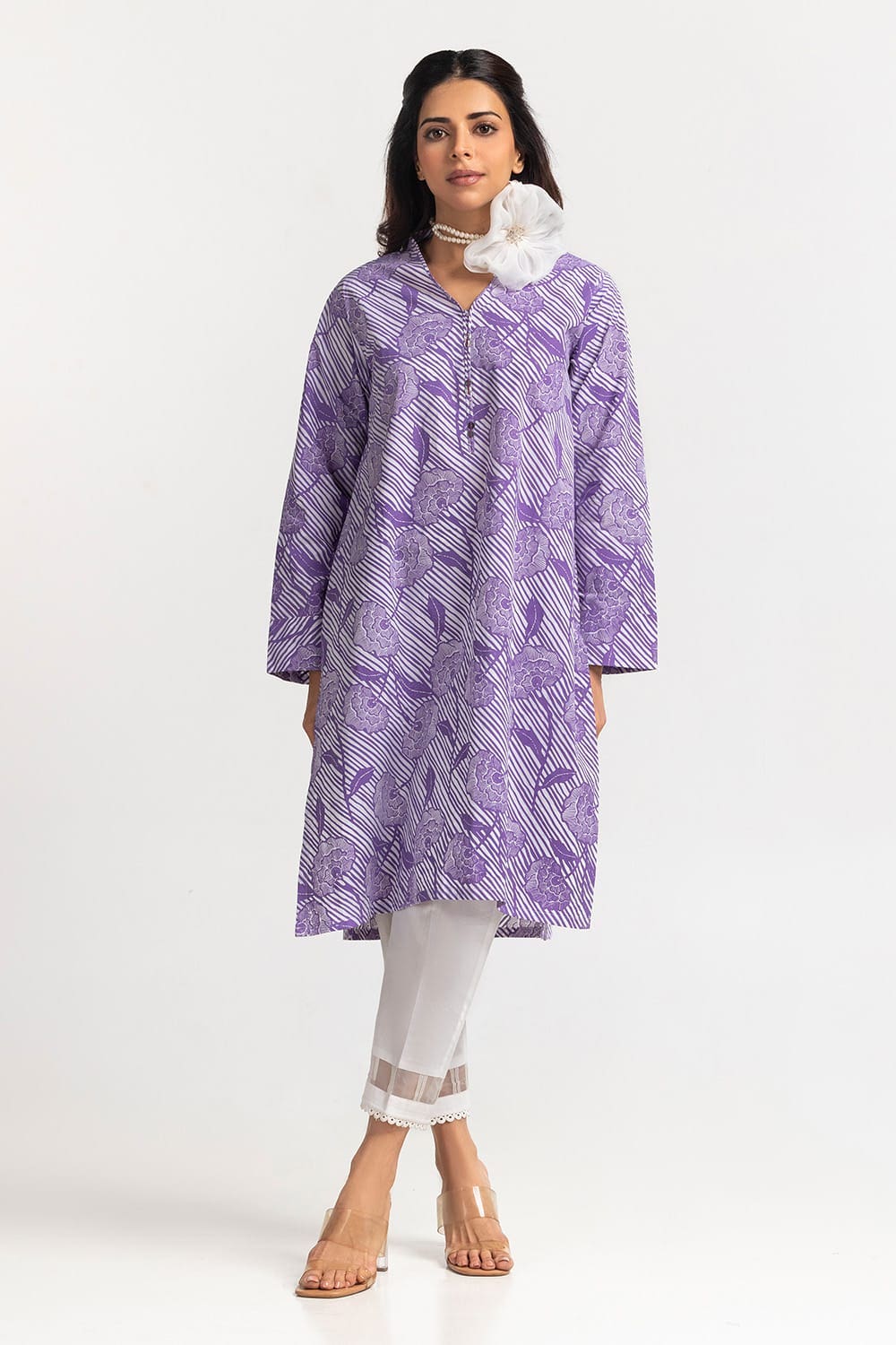 Ready to wear Bloom in beauty with this stunning purple floral kurta. It has a round neckline, full sleeves, and a straight hem. Perfect for a stylish and comfortable look.