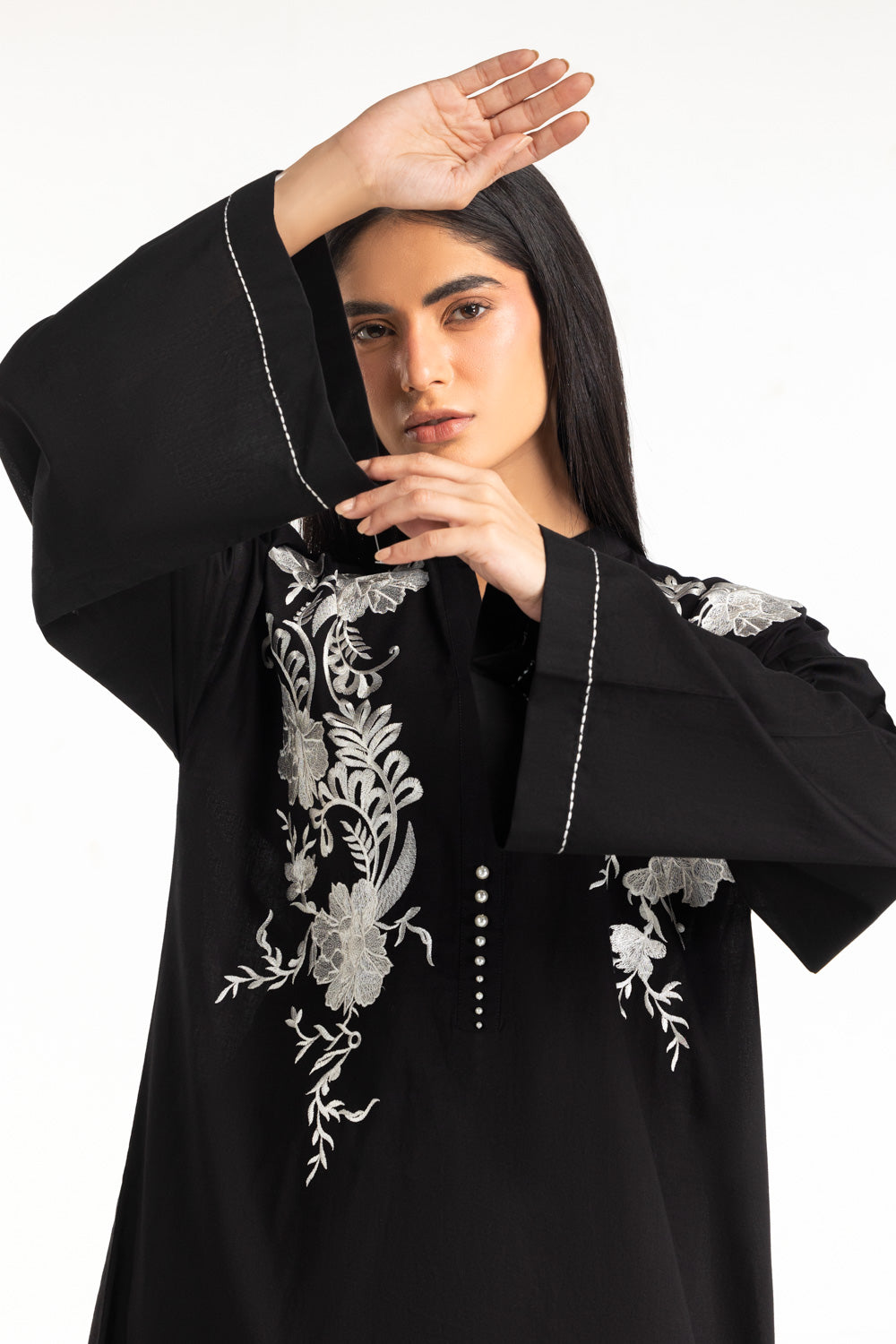 Details: Embroidered co-ord set featuring ben-collar with a v-neckline and delicate pearls.