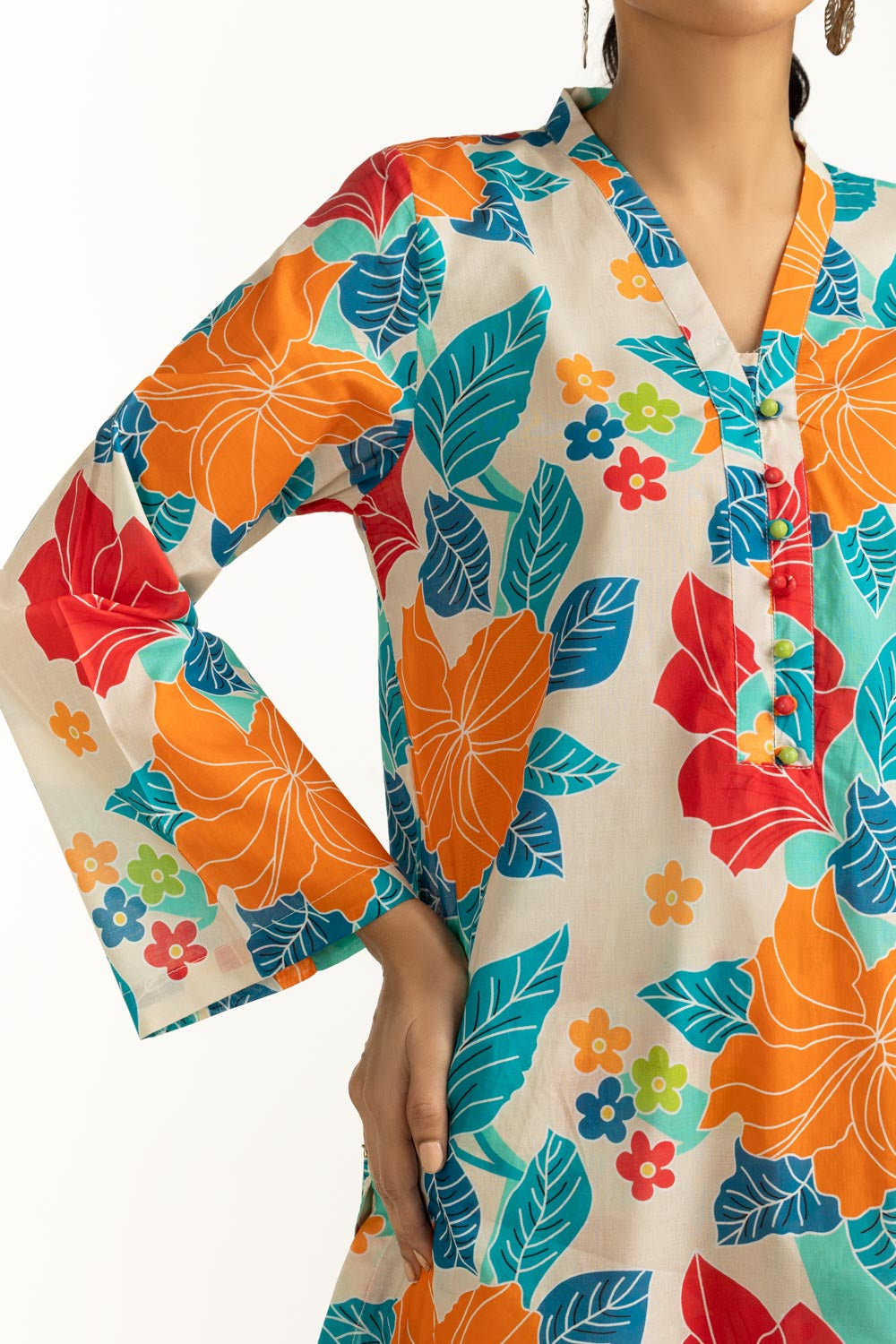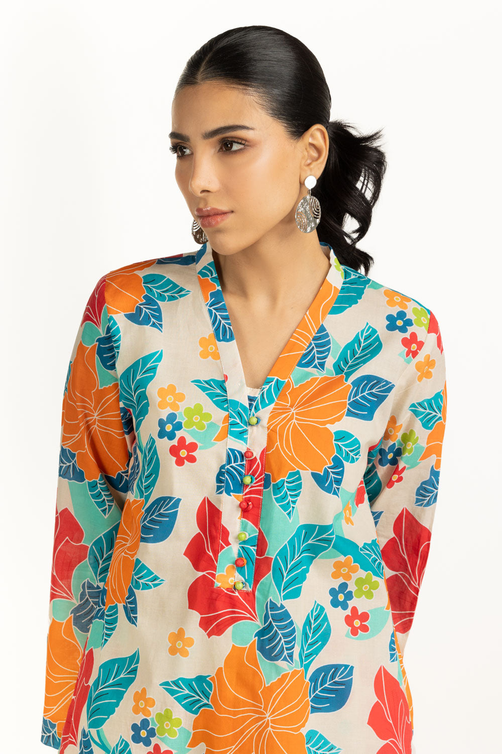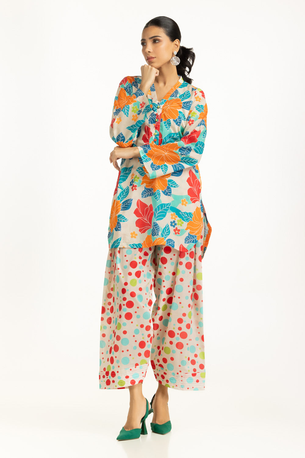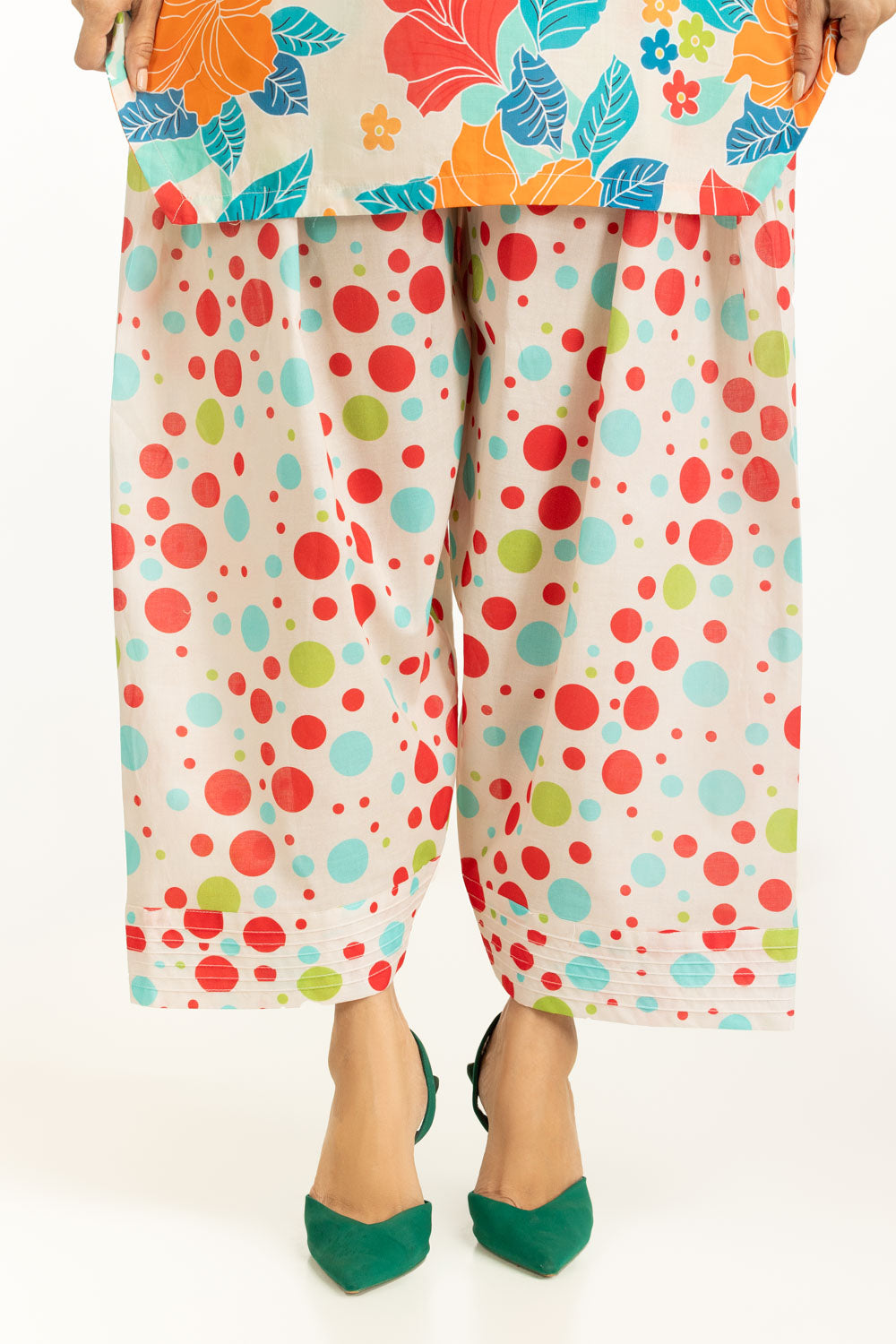 Bring ease and a pop of color to your everyday wardrobe with this cambric co-ord set, designed in a regular fit silhouette. It is detailed with a lively contemporary print on a breathable fabric, that keeps you cool, and stylish. A perfect pick for women who enjoy light yet functional summer wear.
