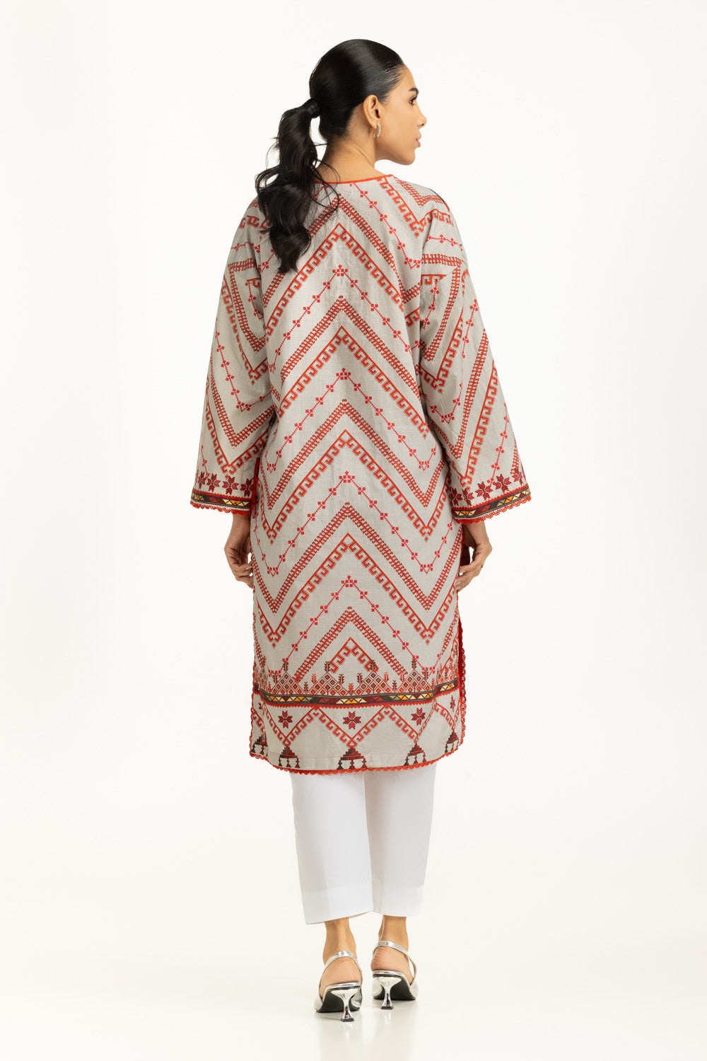 Details: Printed Shirt featuring a Round-Neckline with delicate Lacework and Slit Sleeves.