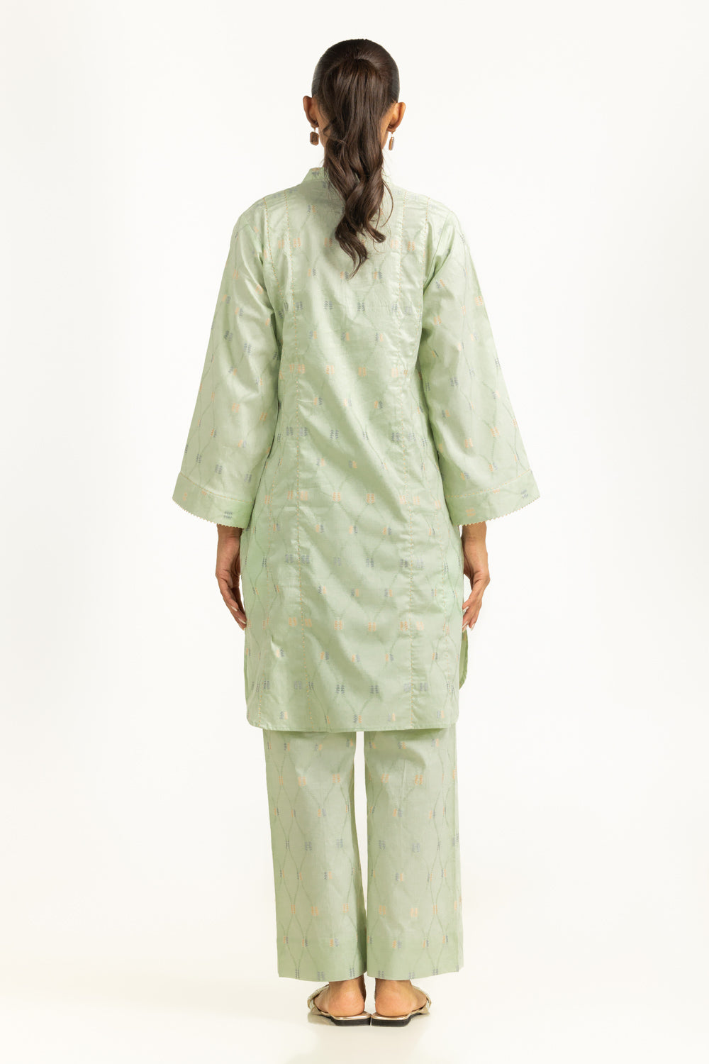 Details: Jacquard Co-ord Set featuring ben-Collar with a V-Neckline and delicate Lacework.