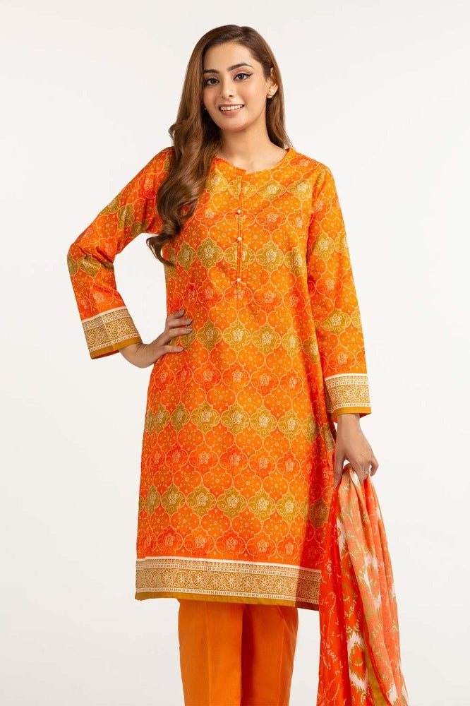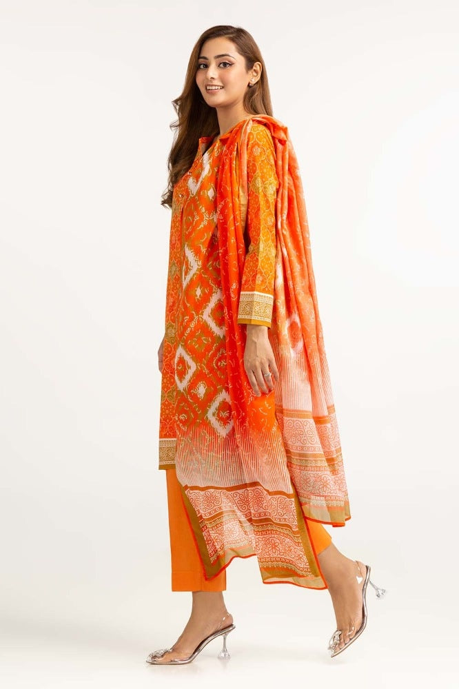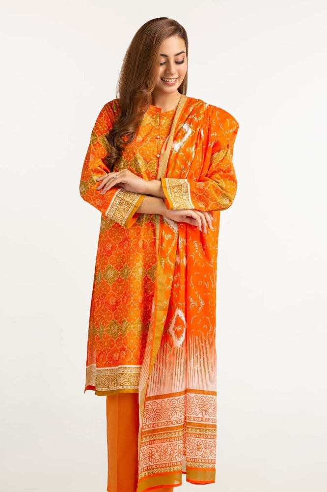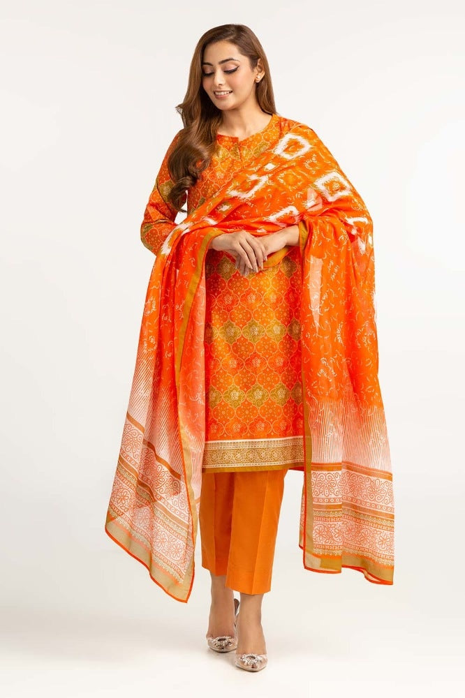 Multicolored digital printed cambric shirt with a round neckline with a V straight sleeves and a rectangular hem. Paired with a matching lawn dupatta and a plain cambric trouser.
