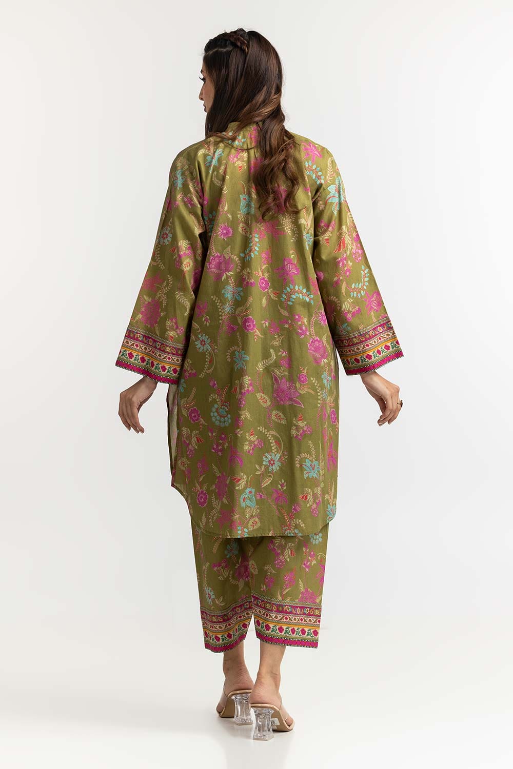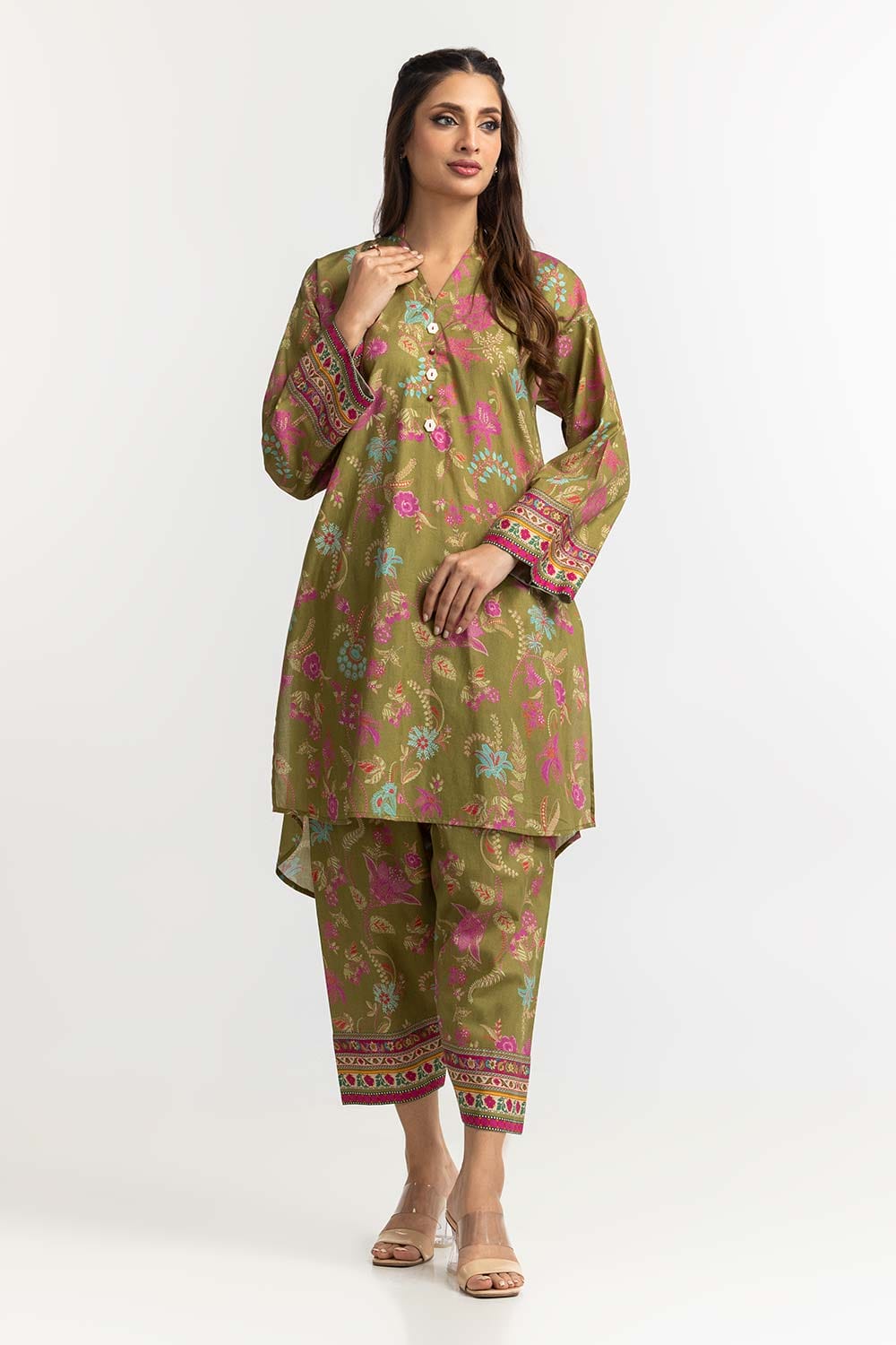 Ready to wear This elegant 2PC green outfit features a delightful floral pattern with vibrant pink accents. The kurta has a relaxed fit with a V-neckline and three-quarter sleeves, complemented by matching pants adorned with intricate border details. Perfect for a stylish, comfortable look