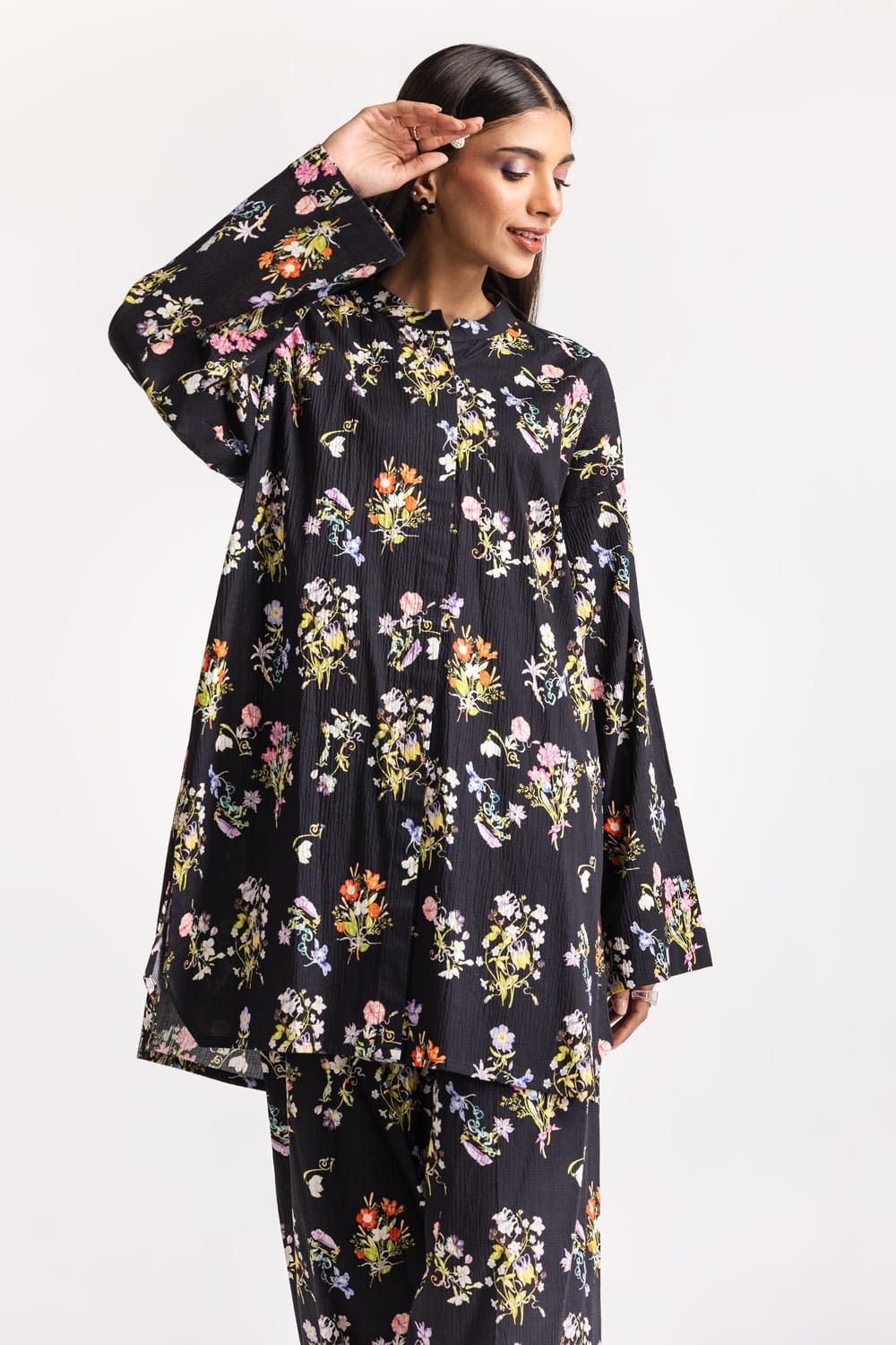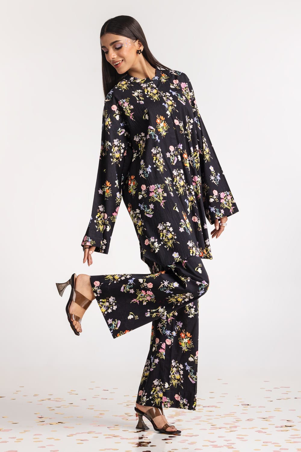 Ready to wear This sophisticated 2PC black ensemble is adorned with delicate floral prints in pastel hues. The kurta features a loose, flowy silhouette with full sleeves and a round neckline, paired with matching wide-leg trousers. Perfect for a chic and elegant look.