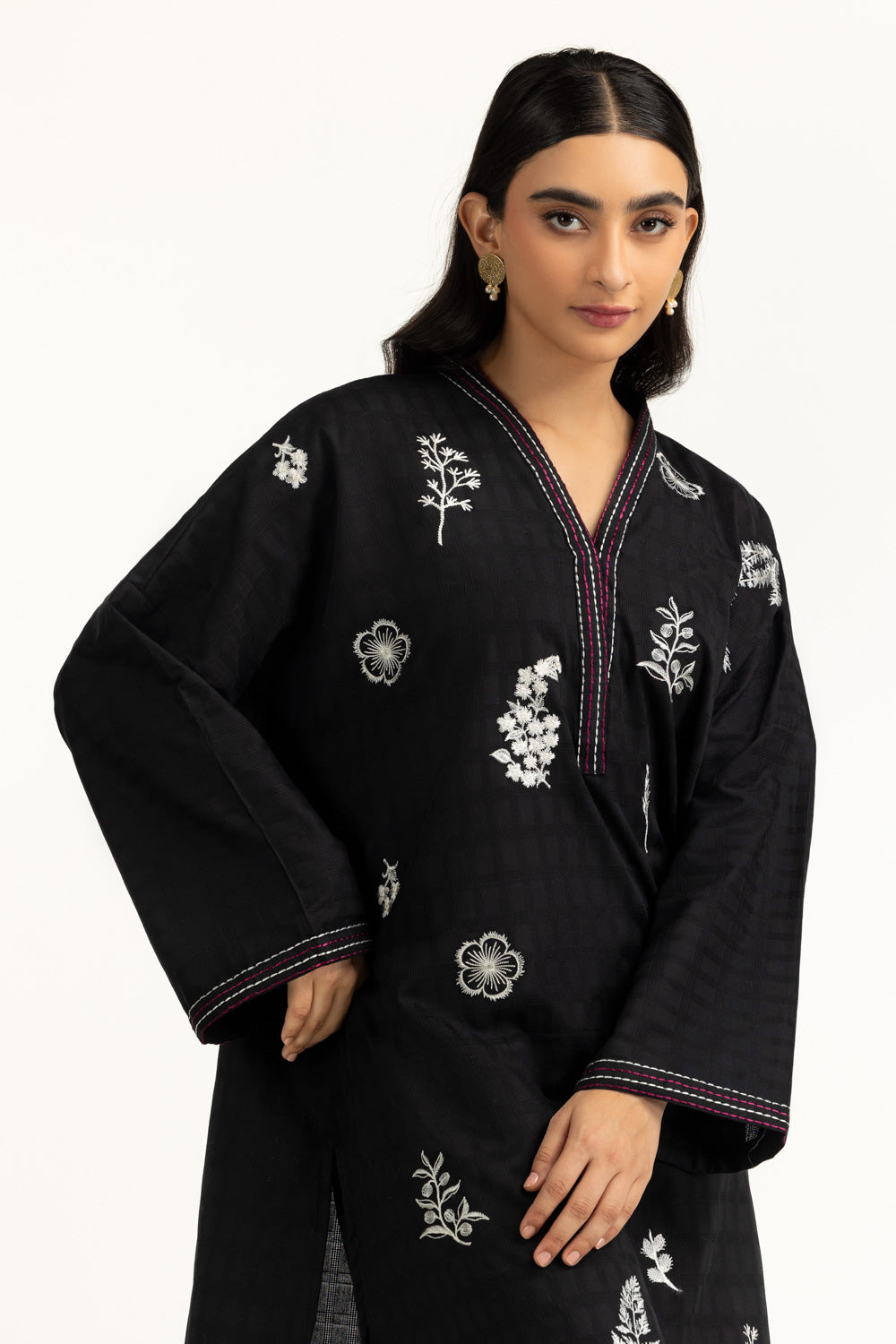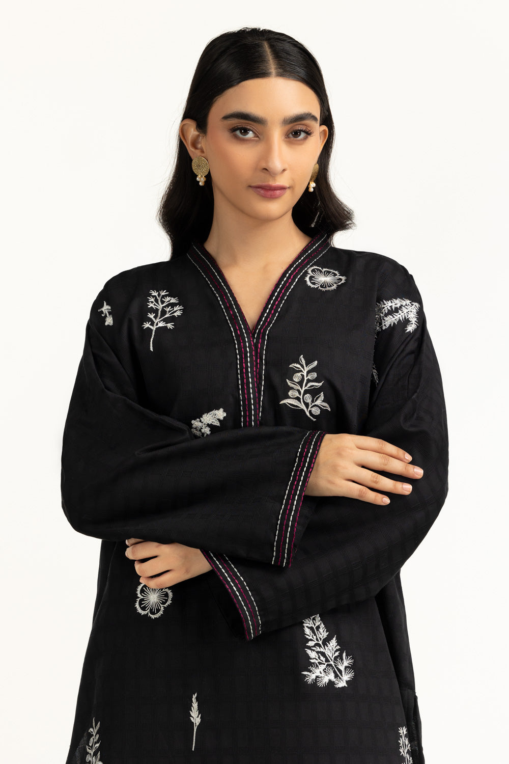 A timeless black co-ord set that blends everyday ease with craft. The sturdy dobby fabric brings texture and movement, while the intricate embroidery adds a feminine touch. Its loose fit silhouette ensures comfort through crisp winter days with effortless poise.