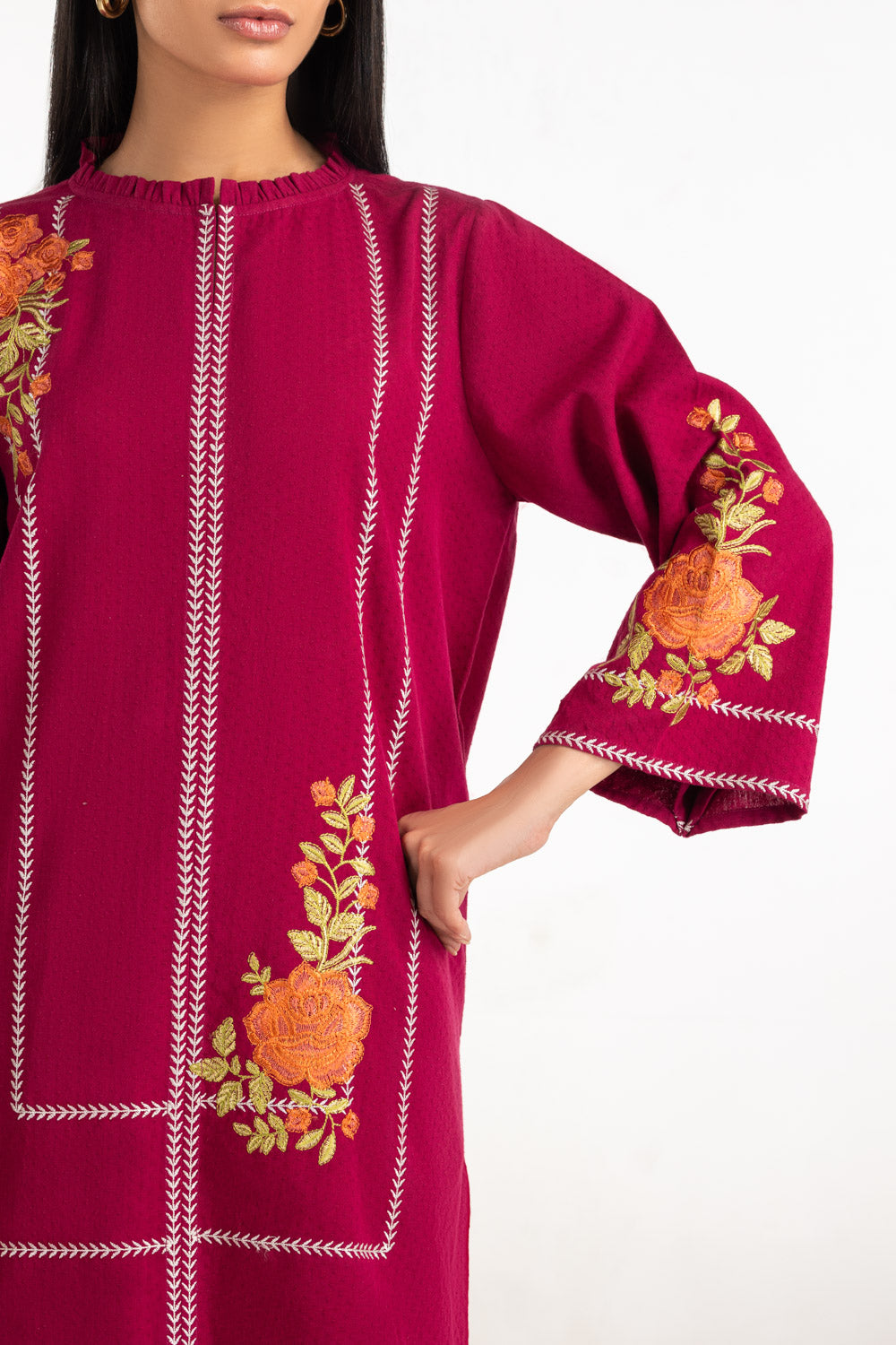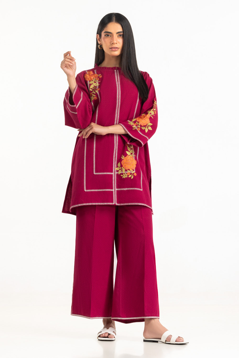 Subtle dobby texture combined with fine floral embroidery brings depth and charm to this stylish co-ord set. The regular-fit shirt maintains a graceful silhouette while staying breathable for summer days. Paired with matching trousers, it offers a lively ethnic outfit suitable for casual outings and small gatherings.