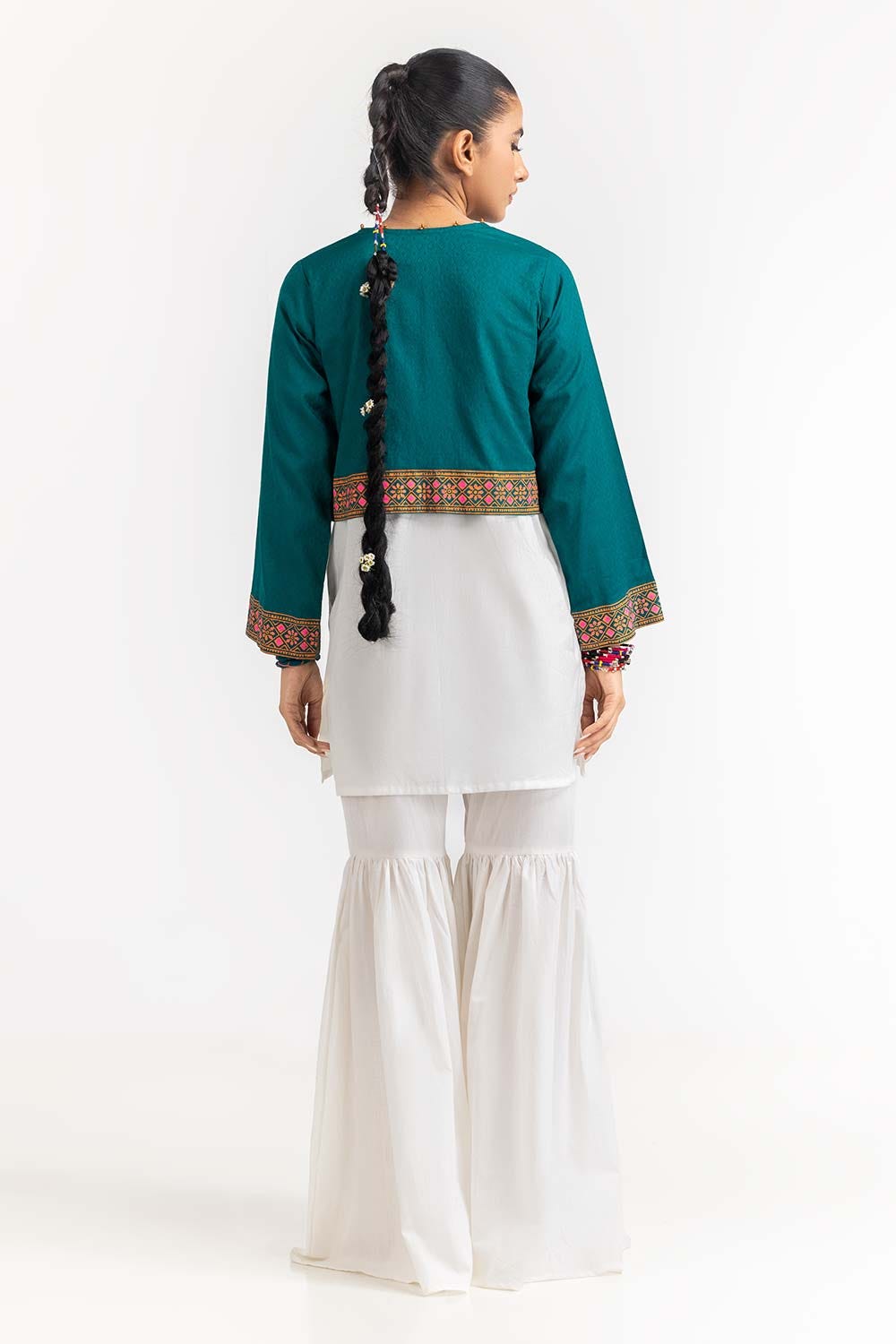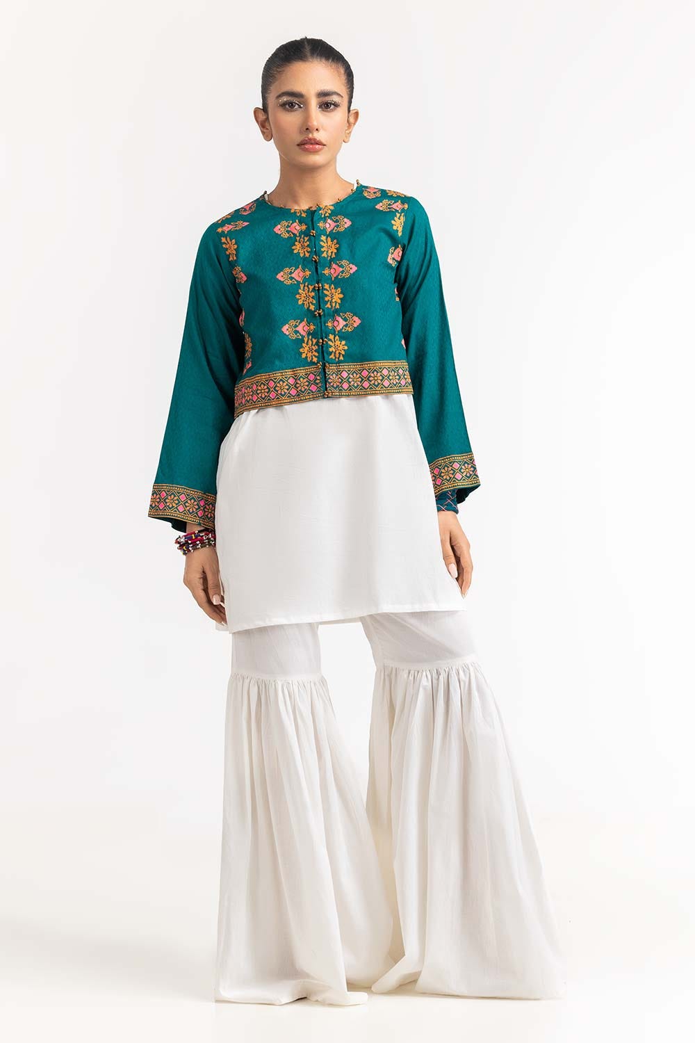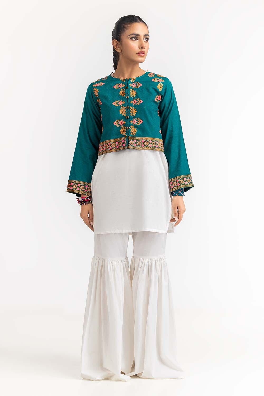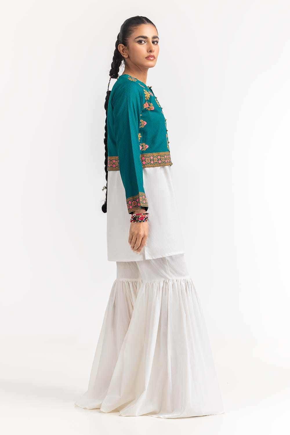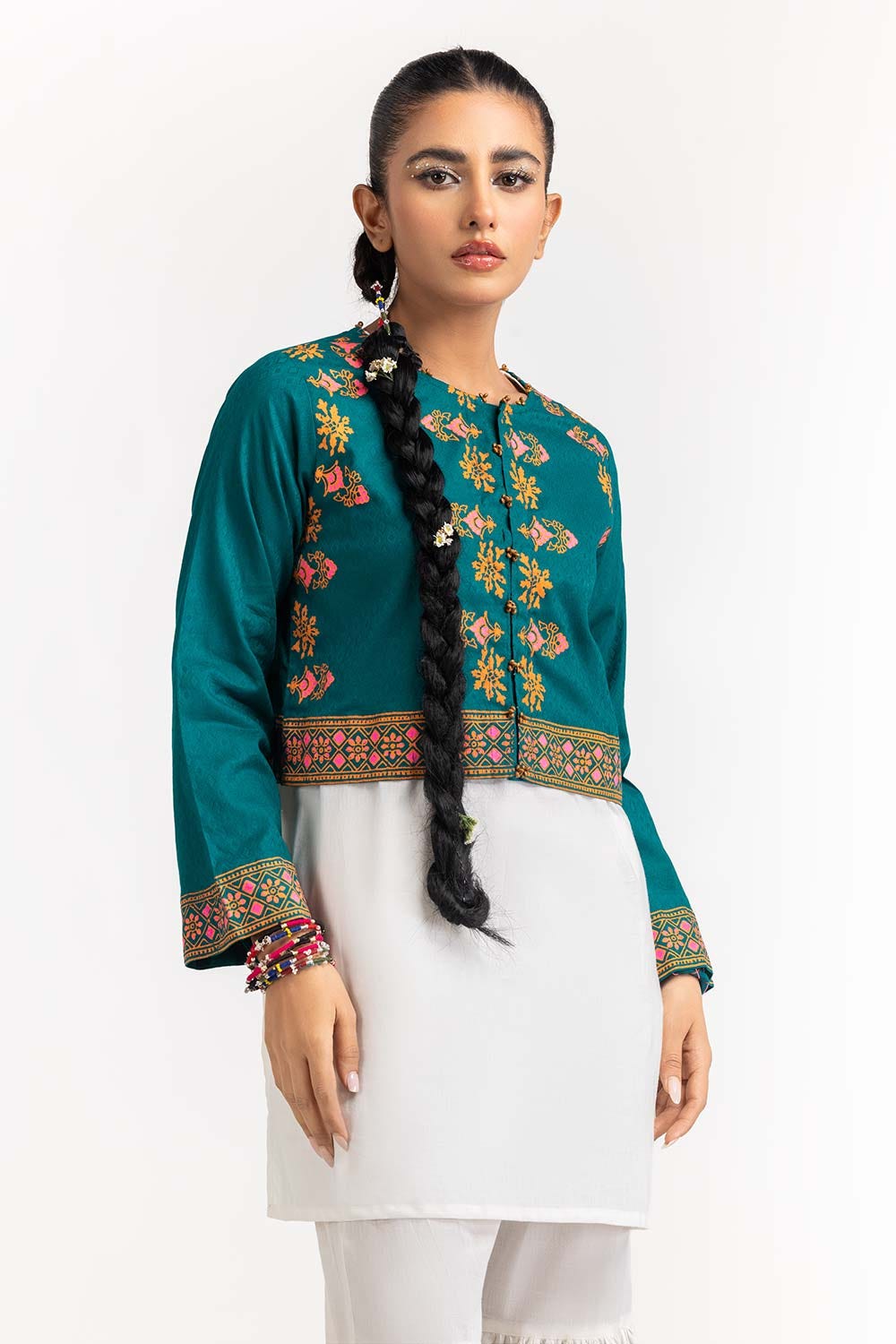 Ready to wear Sea green self dobby waistcoast with screenprint and handwork.