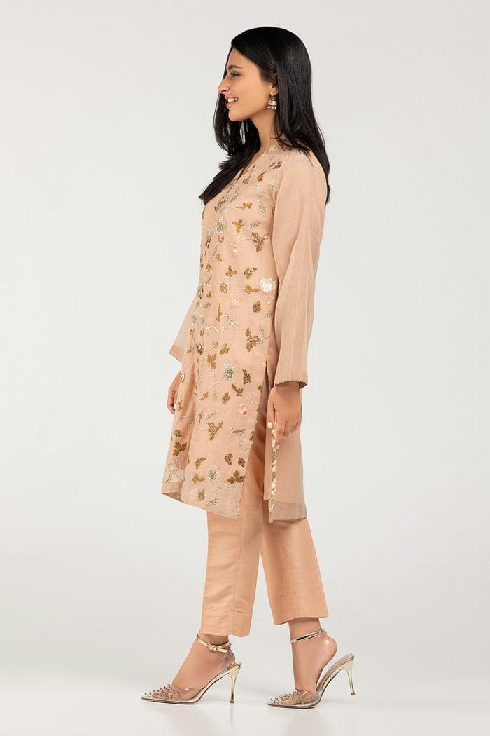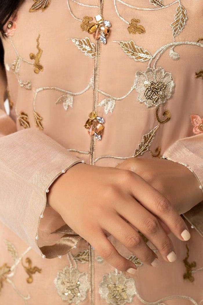 Ready to wear Peach dyed messuri embroidered shirt with faux button-down plackets and straight sleeves.