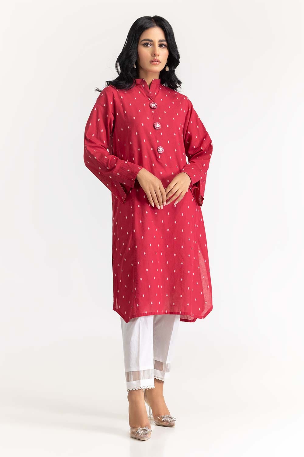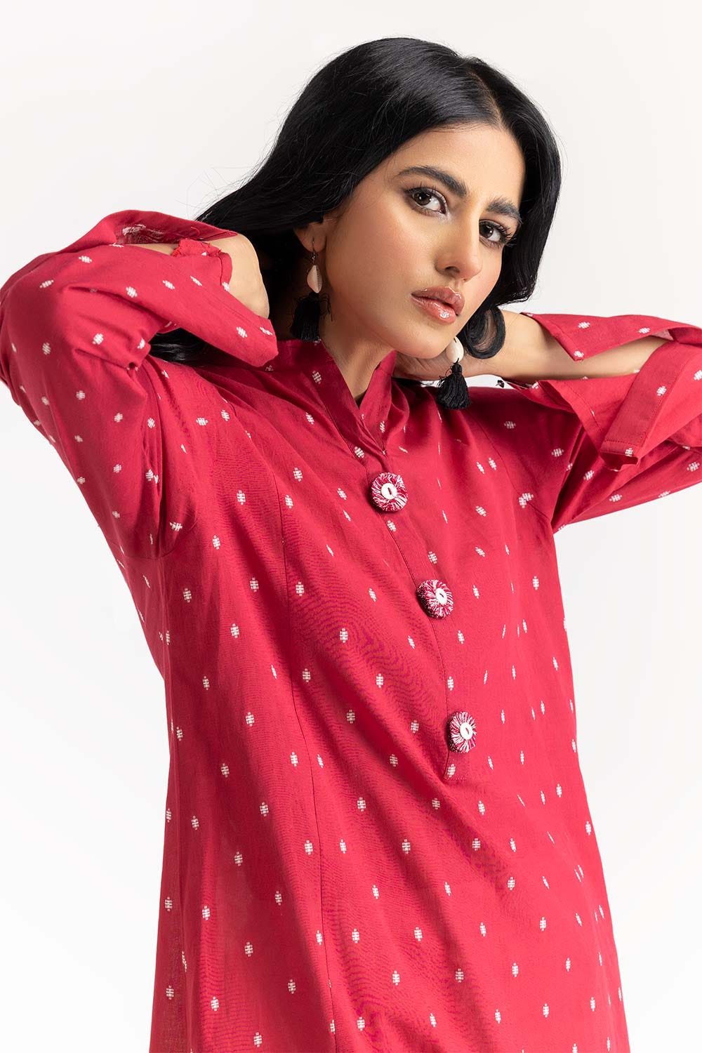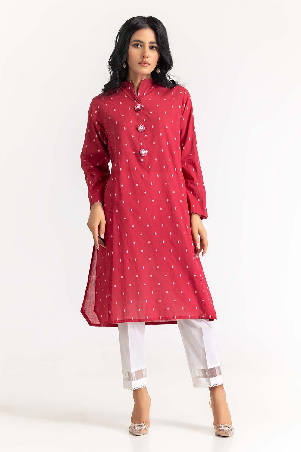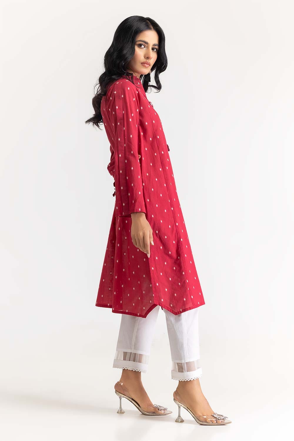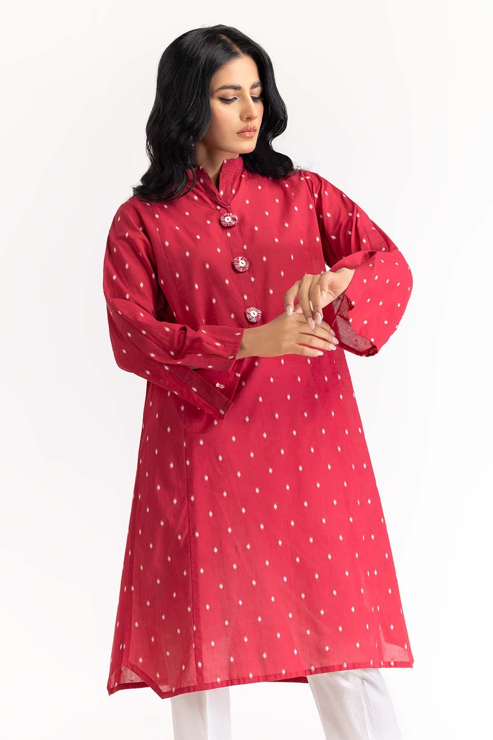 Ready to wear Red dyed jacquard shirt featuring a band collar with a v, straight sleeves and a assymetrical hem.