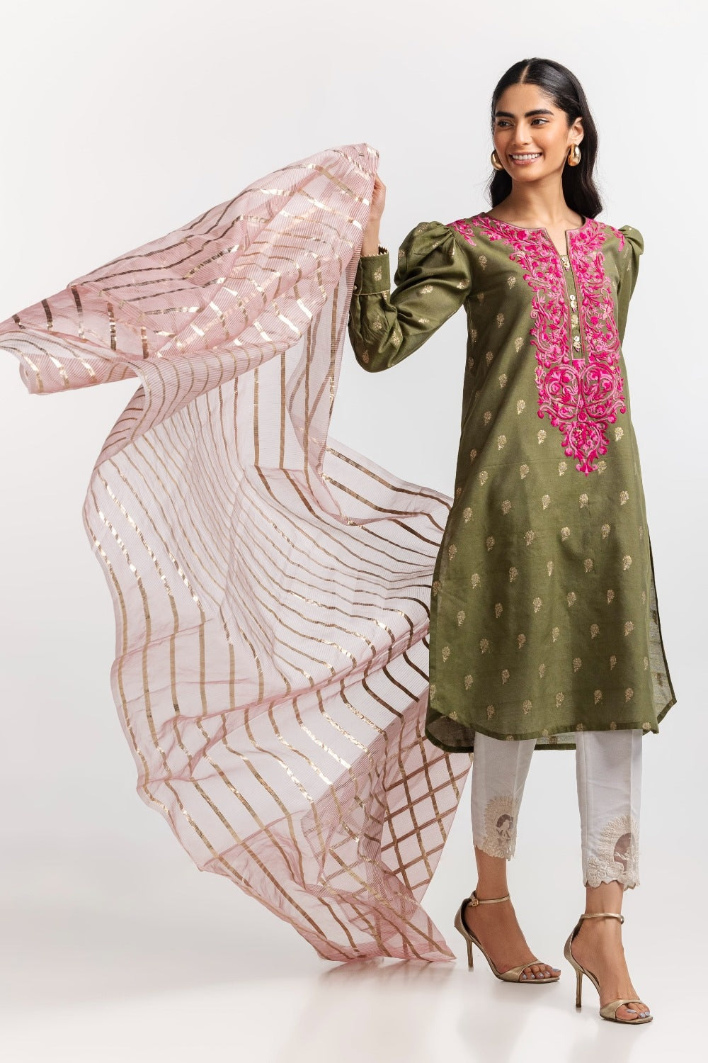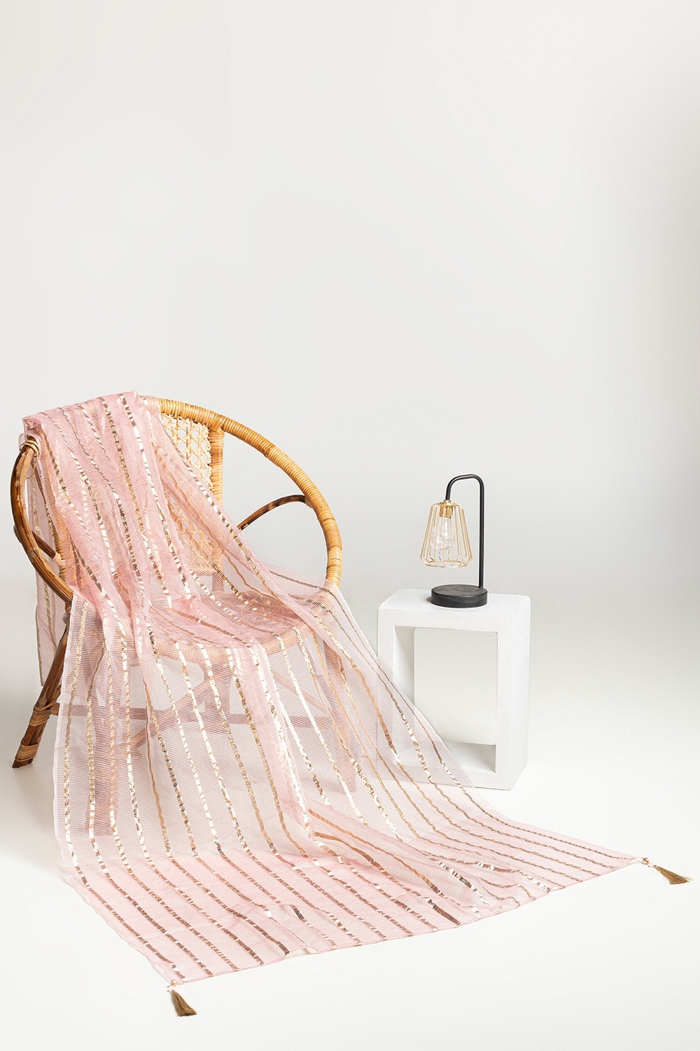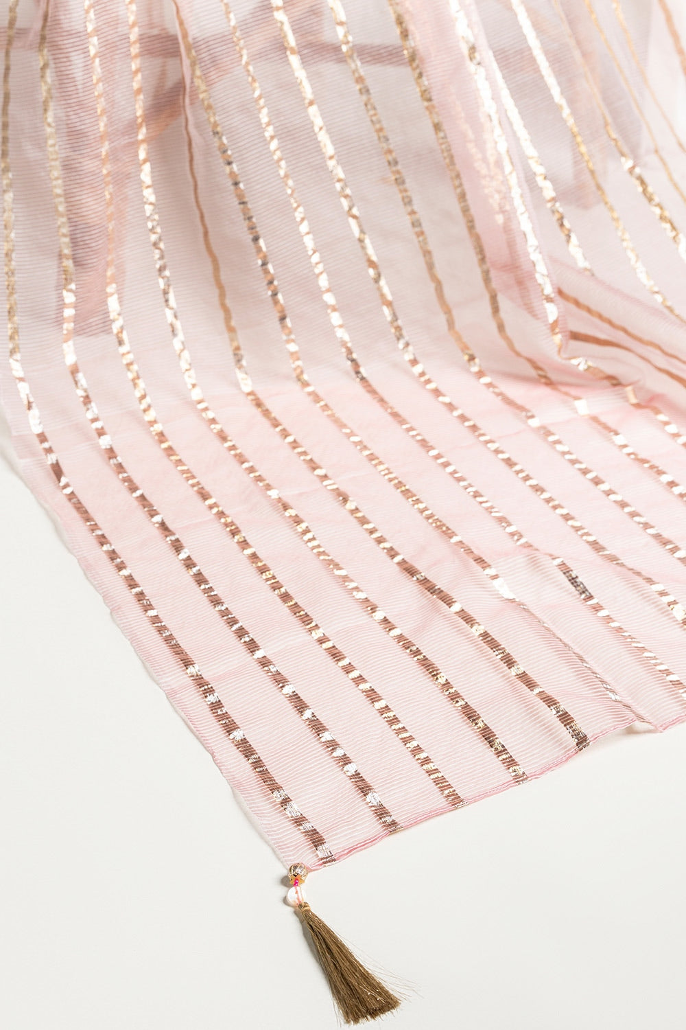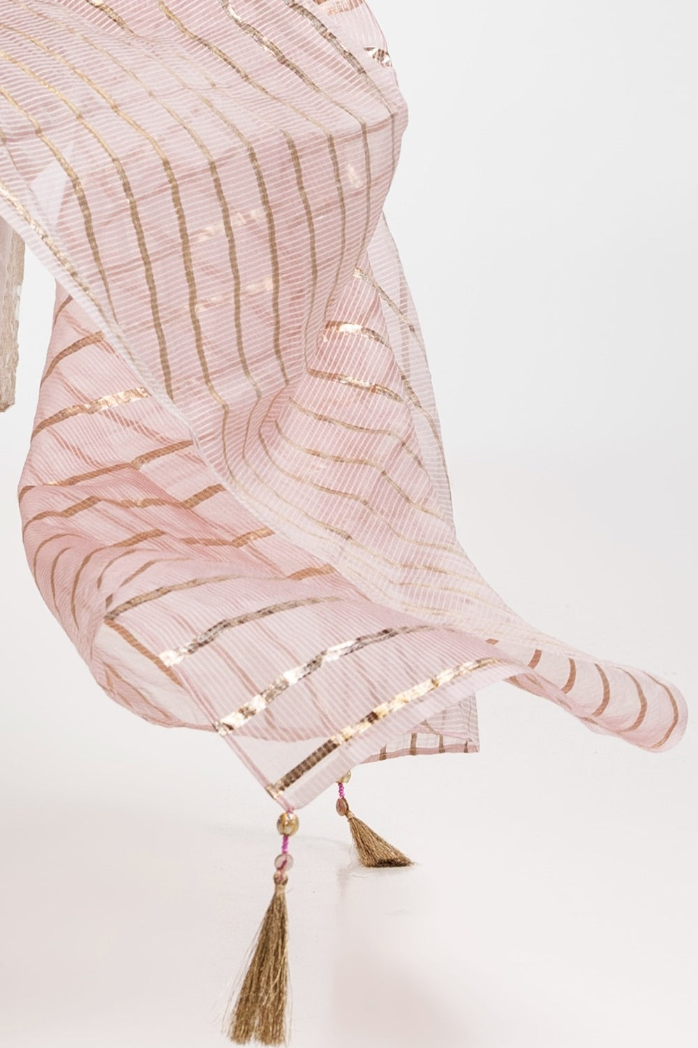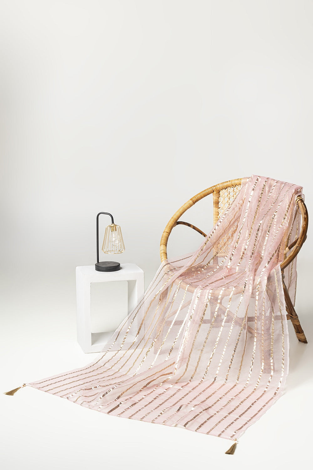 Ready to wear Complete your ensemble with this elegant pink dupatta, adorned with gold stripes and intricate detailing along the edges. The lightweight fabric and luxurious design make it an ideal accessory for adding a touch of sophistication to any outfit.