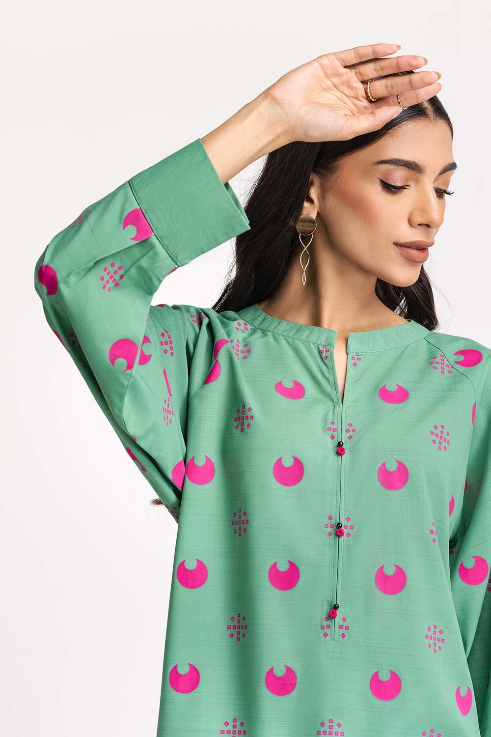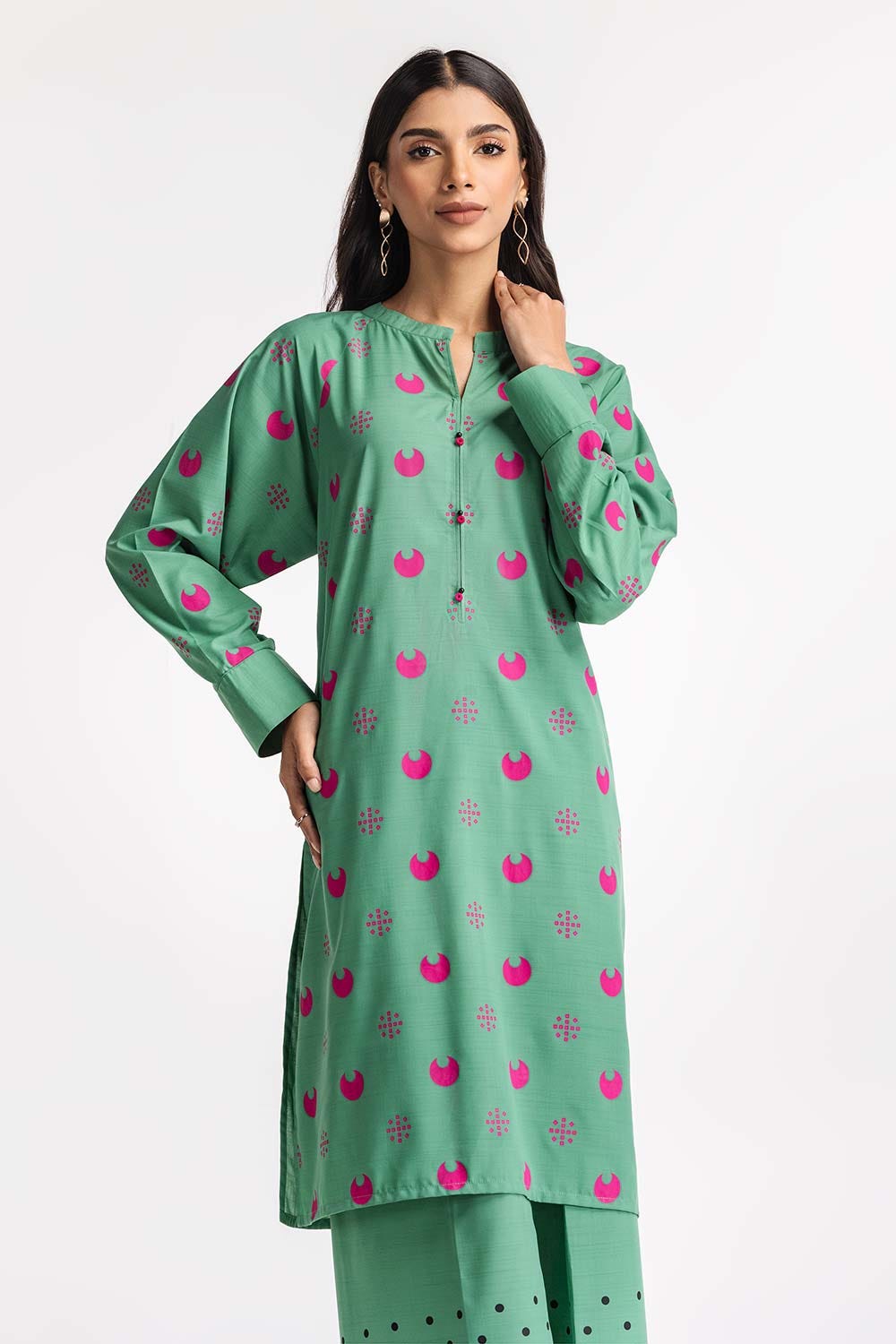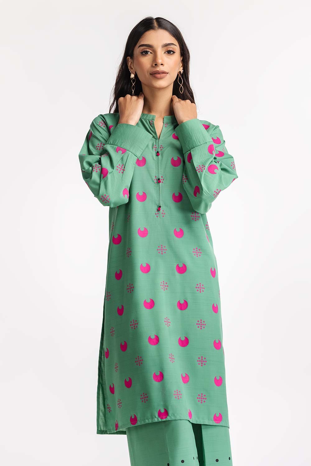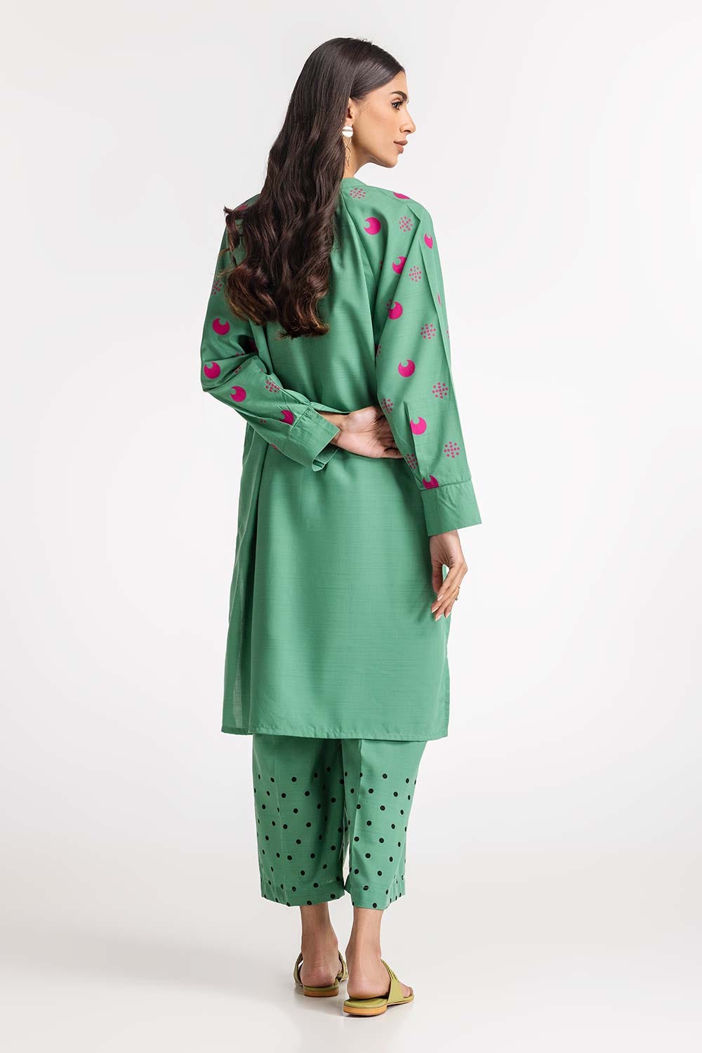 Ready to wear Elevate your style statement with this 2PC green dyed screen printed shirt featuring a v-collar with subtly embellished placket, bishop sleeves, and beautiful print patterns on the overall front, paired with straight polka dot printed trousers to complete the look.