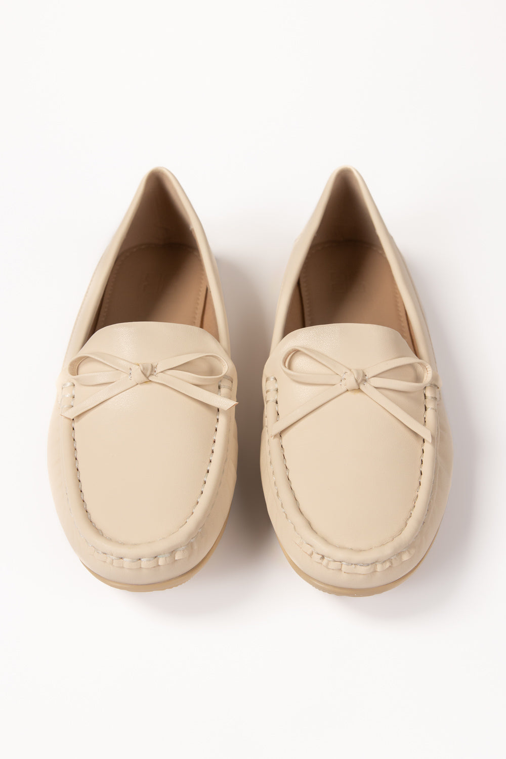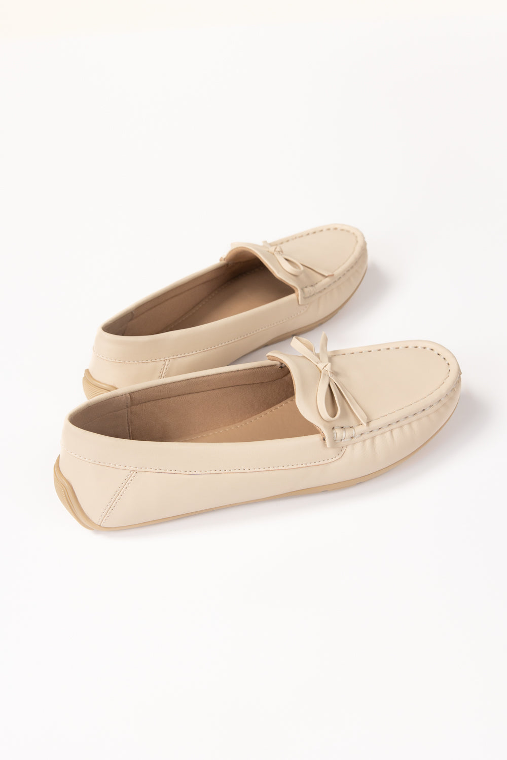 These beige moccasin-style loafers feature a clean, minimalist design with a bow detail and fine stitching. Crafted from smooth faux leather, they offer both elegance and comfort. The flexible rubber sole ensures durability and provides optimal support for all-day wear.