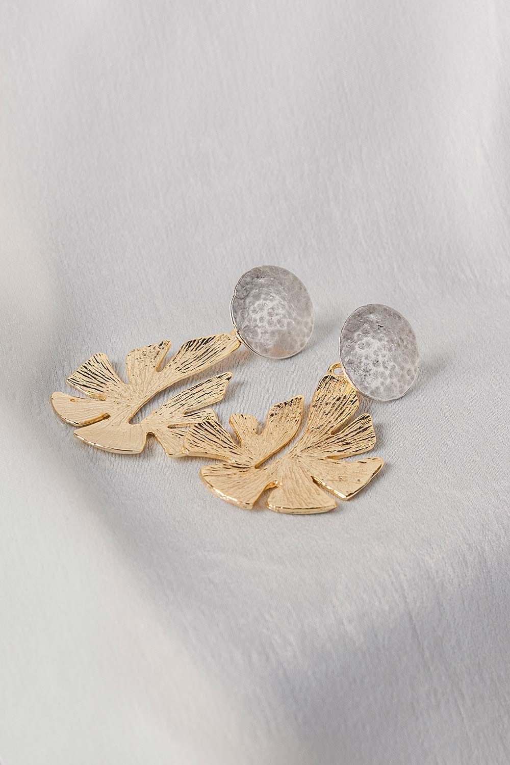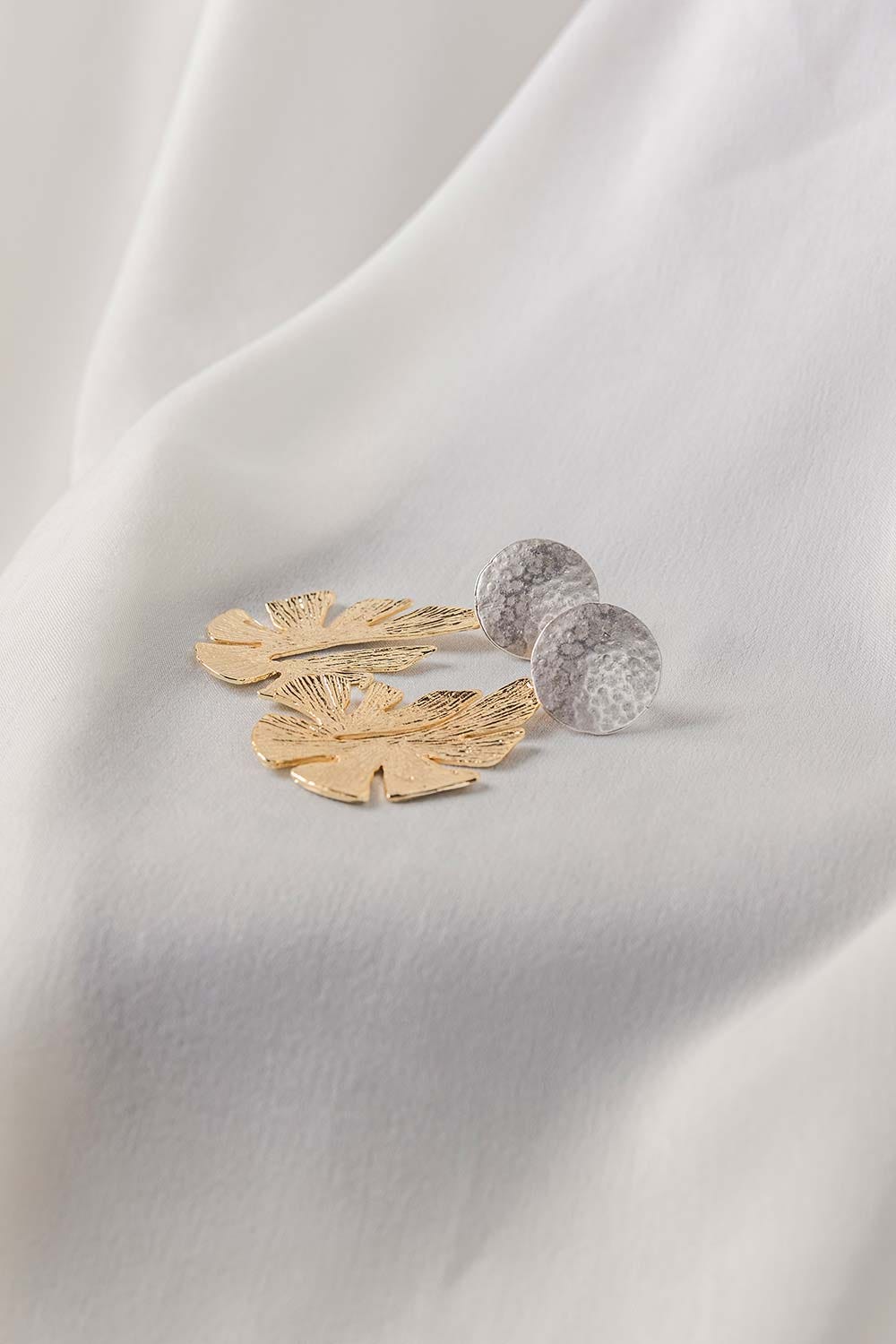 This statement piece, featuring a gold leaf attached to a silver textured round base, marries the natural world with artisanal craftsmanship, creating an accessory that's both eye-catching and elegantly refined.