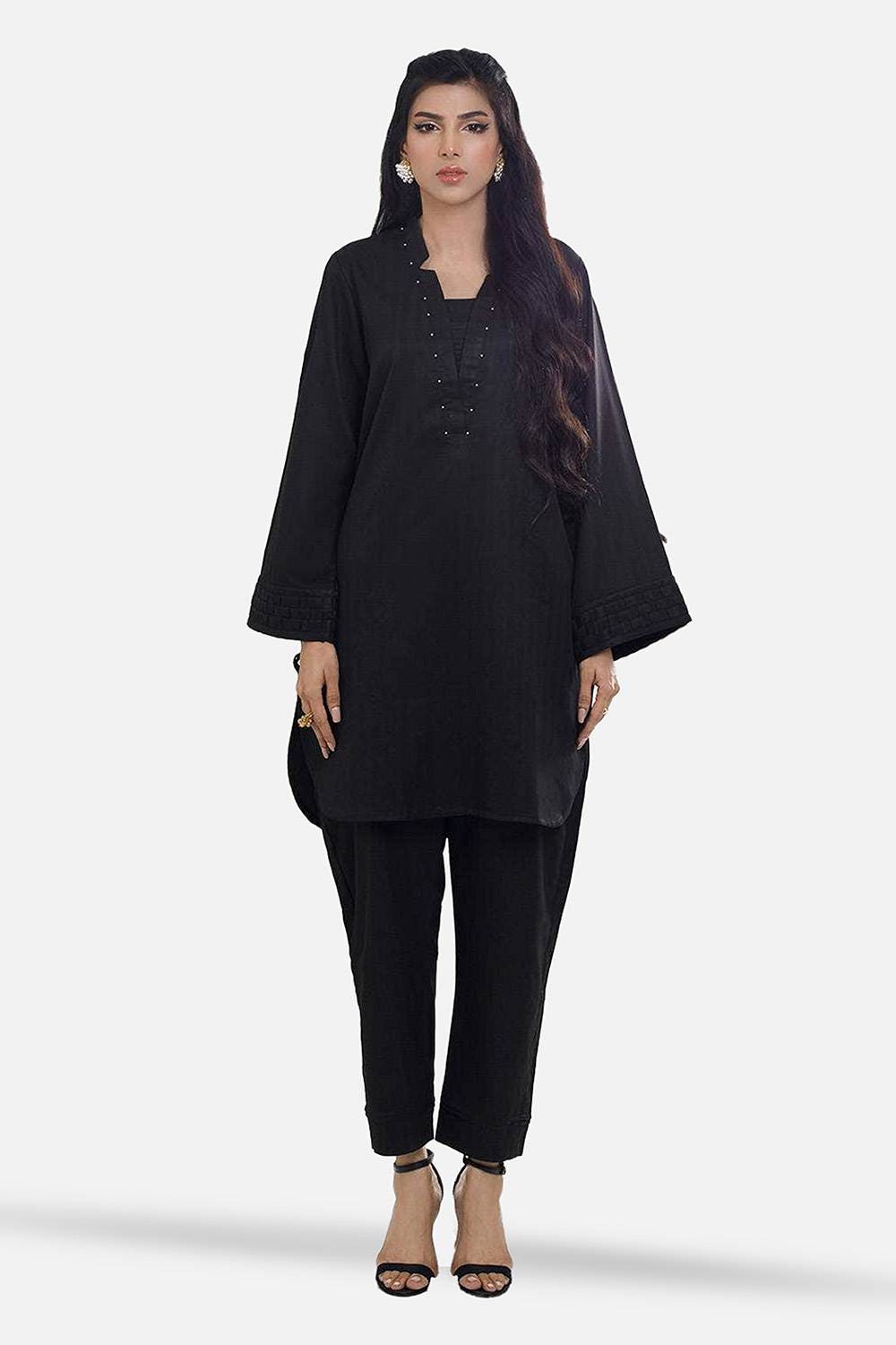 Ready to wear Embrace elegance with this black V-neck Co-Ord set with button details, wide sleeves, and a straight hem, paired with sleek straight-leg pants for a timeless, chic ensemble.