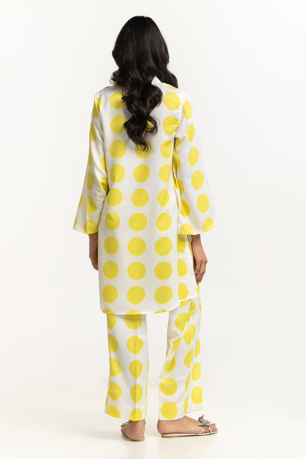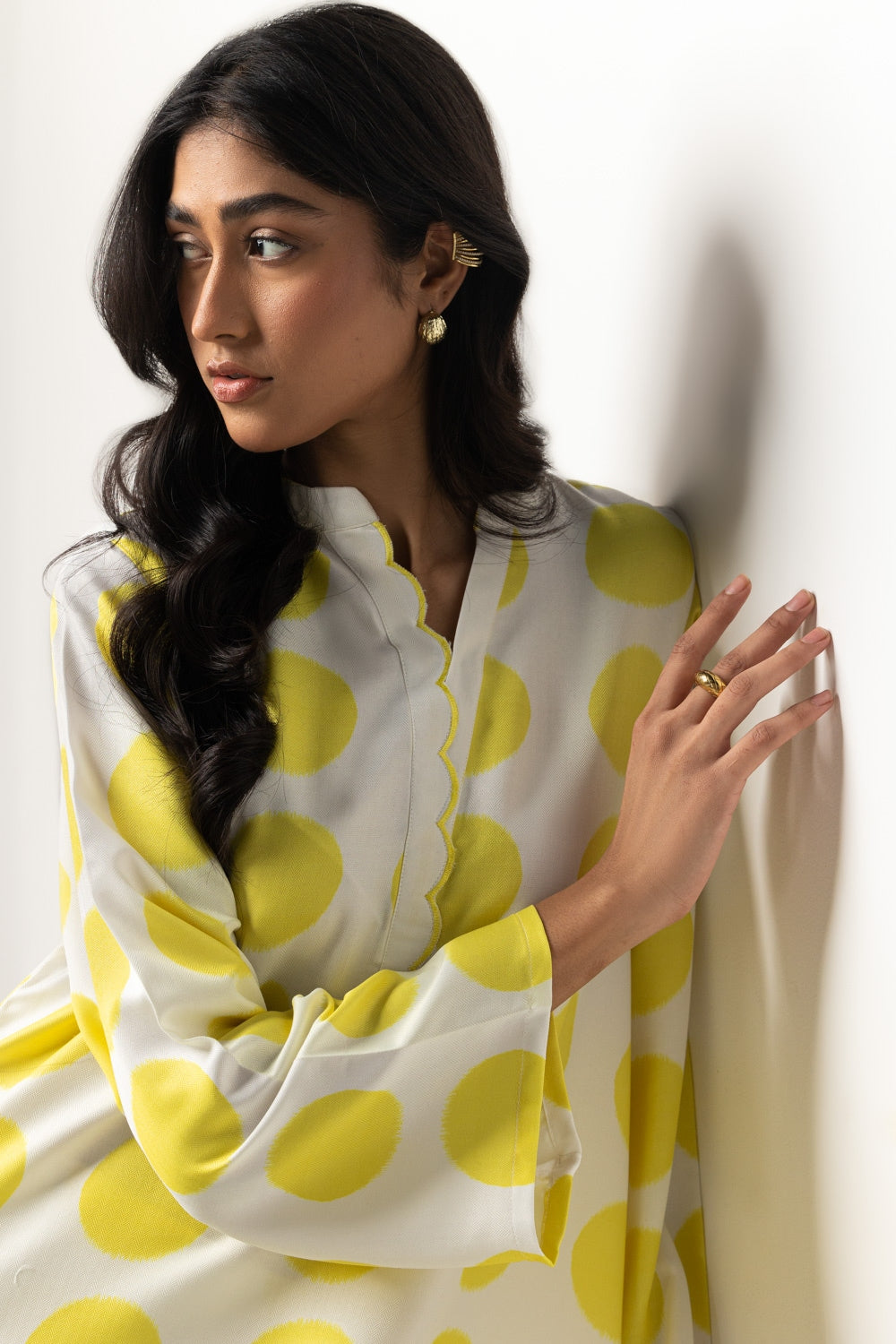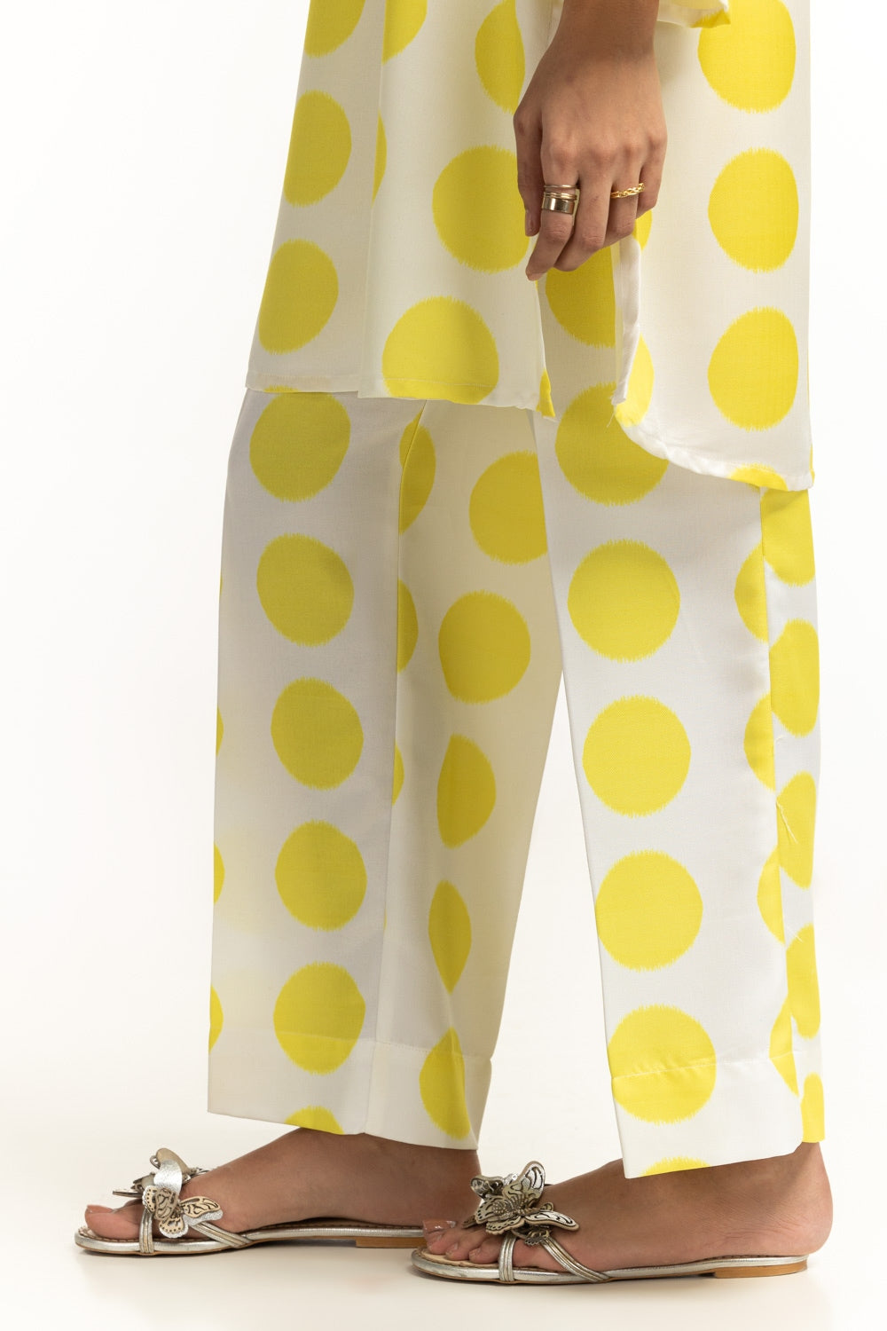 This bright yellow polka dot co-ord set is a pure summer joy. The breezy shirt featuring minimal embellishment on the neckline with a matching trouser offer a playful look perfect for picnics, brunches or weekend adventures to feel cheerful all day long.