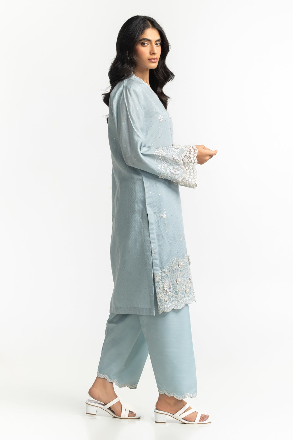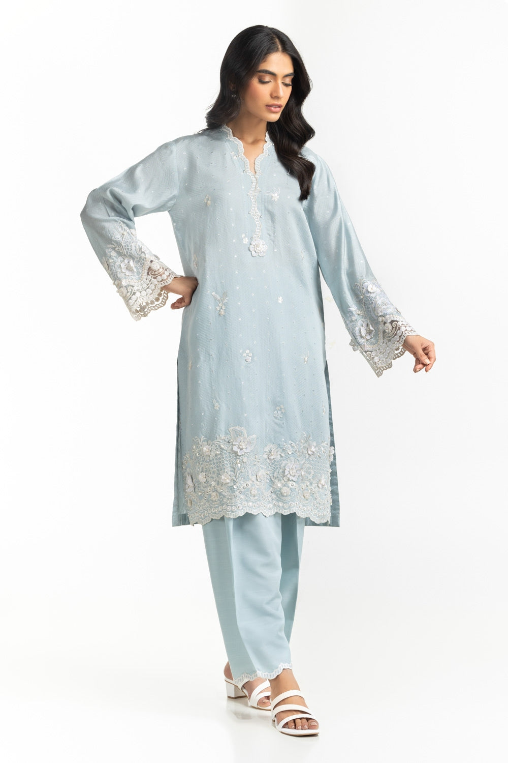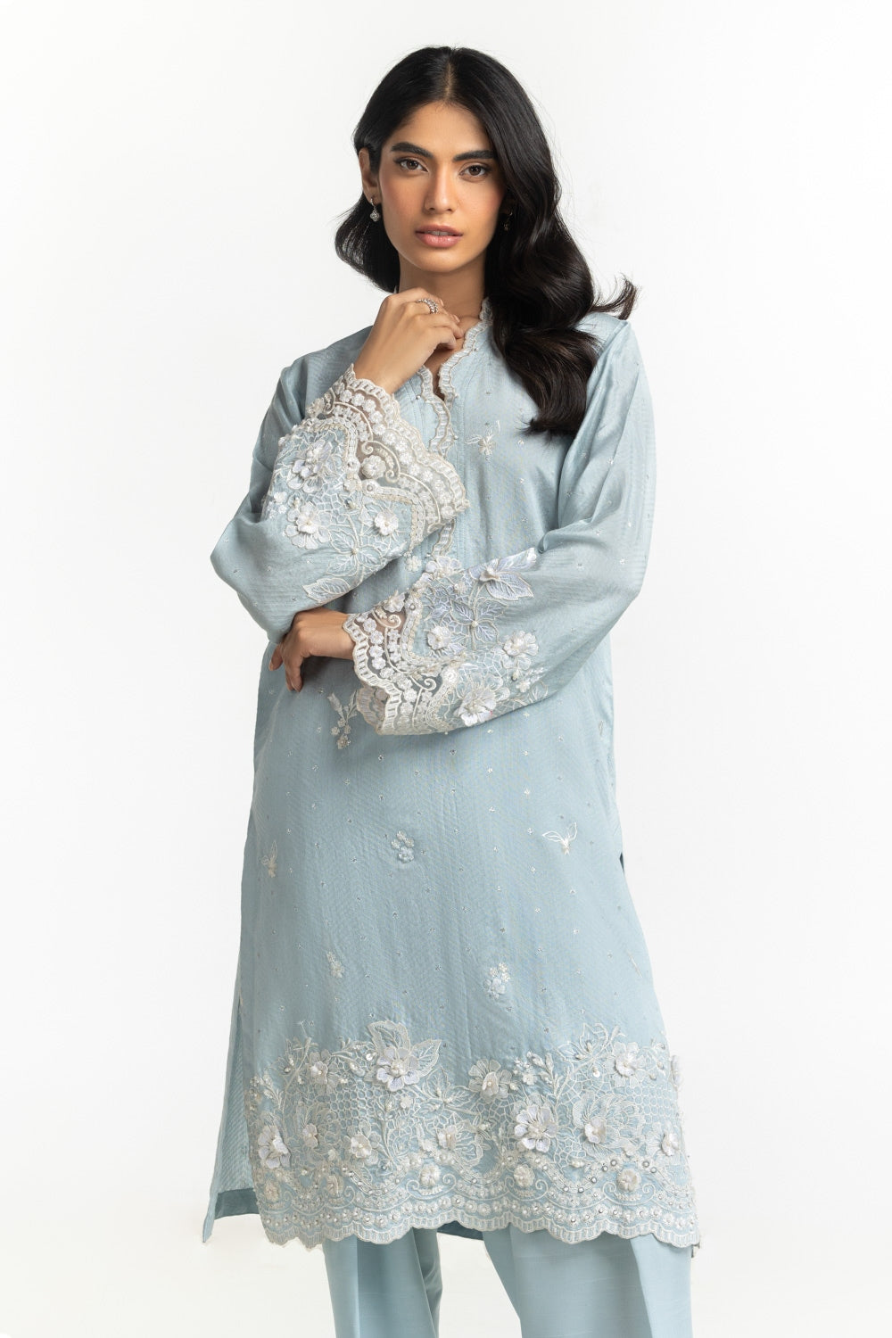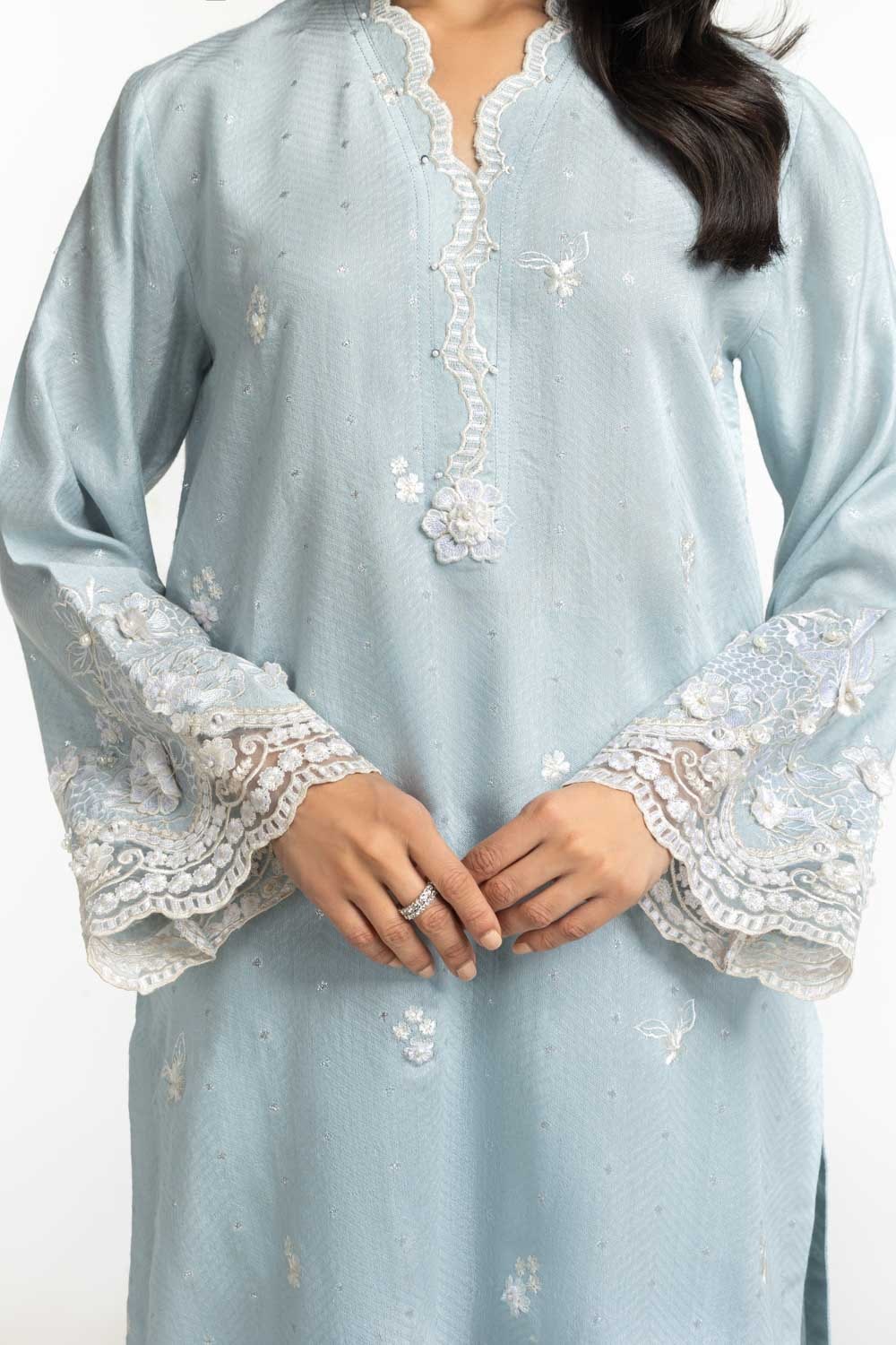 Witness the artistry of detailed embroidery with pearls and 3D flowers on the sleeves and hem adorning this beautiful festive ensemble. Complemented by matching trousers for a polished look, this outfit offers a traditional look, perfect for special occasions all season long.