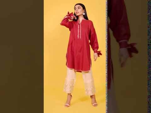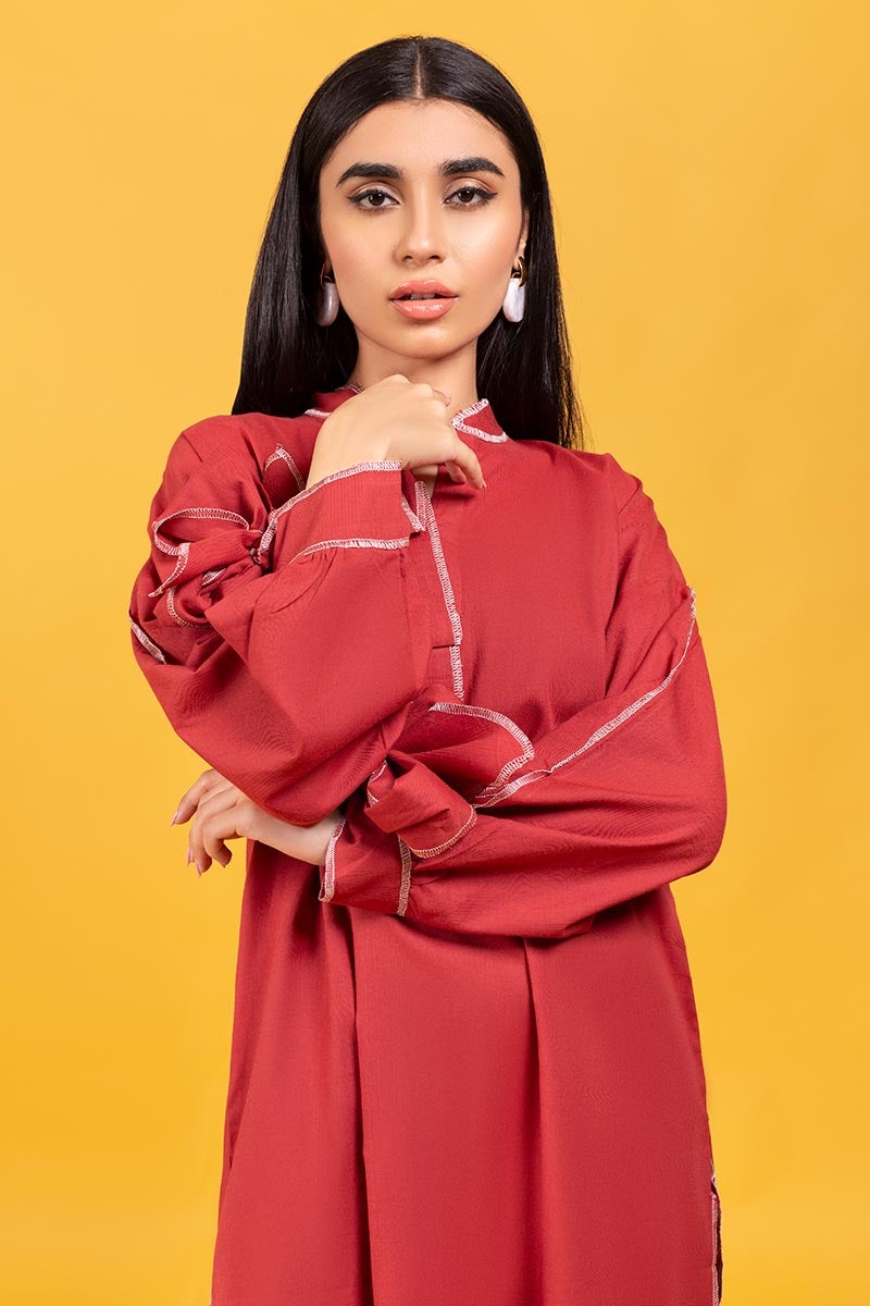 Ready to wear Maroon, self-jacquard 100% cotton, boxy shirt with knotted sleeves with placket and sleeves detailing