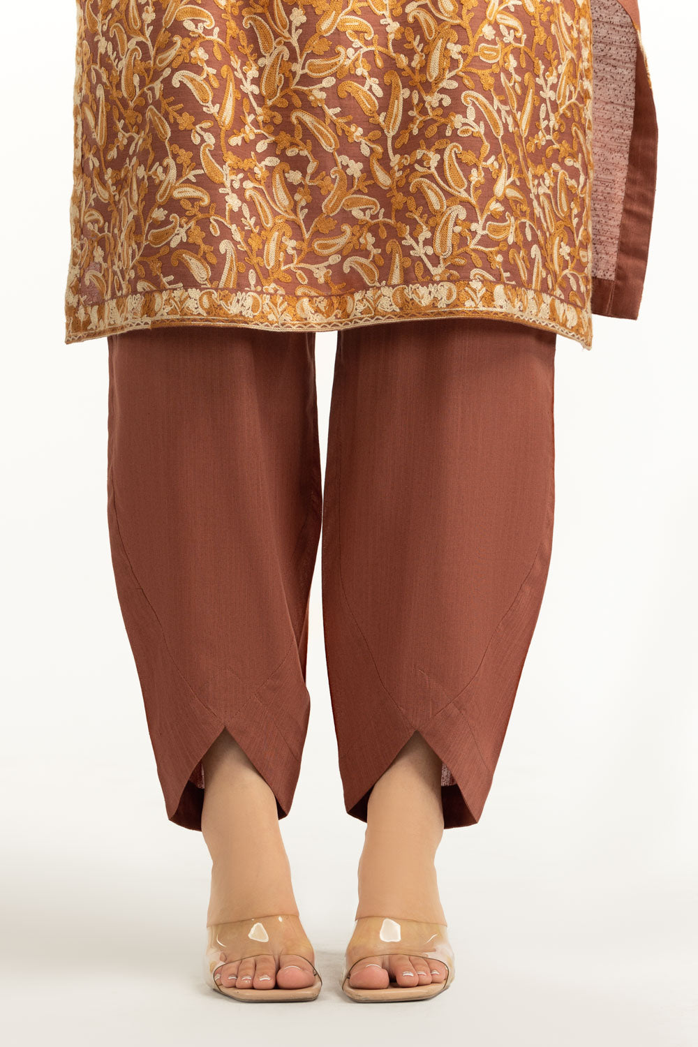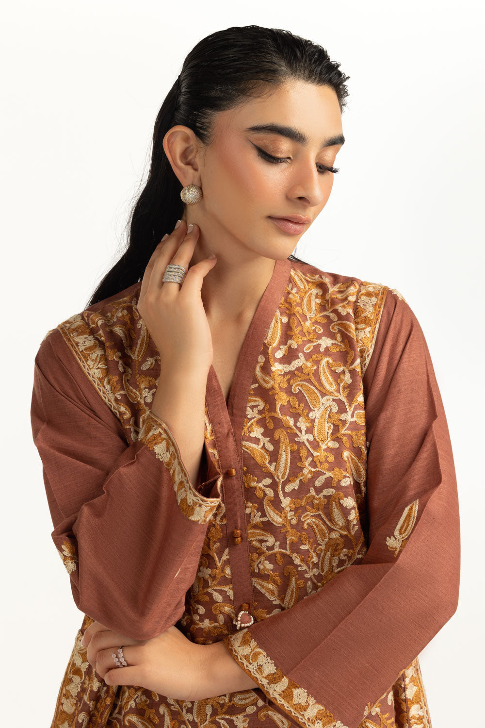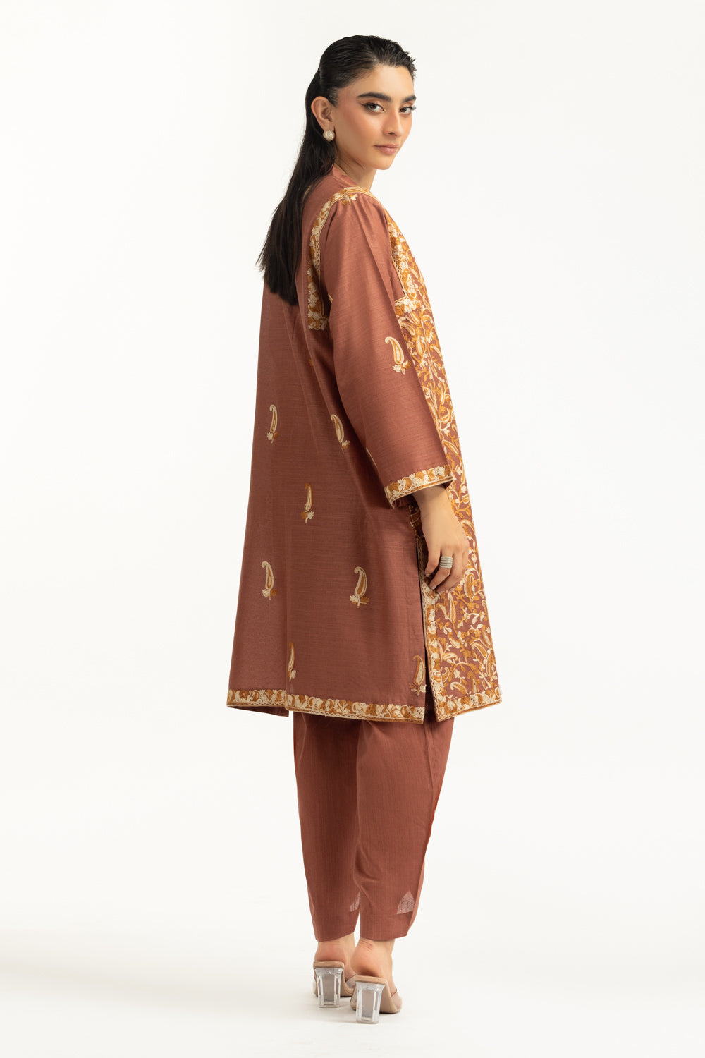 Featuring detailed embroidery, this brown co-ord set offers functionality and ease through its regular fit. The karandi fabric provides lightweight warmth without compromising on comfort. A perfect choice for coordinated winter dressing.