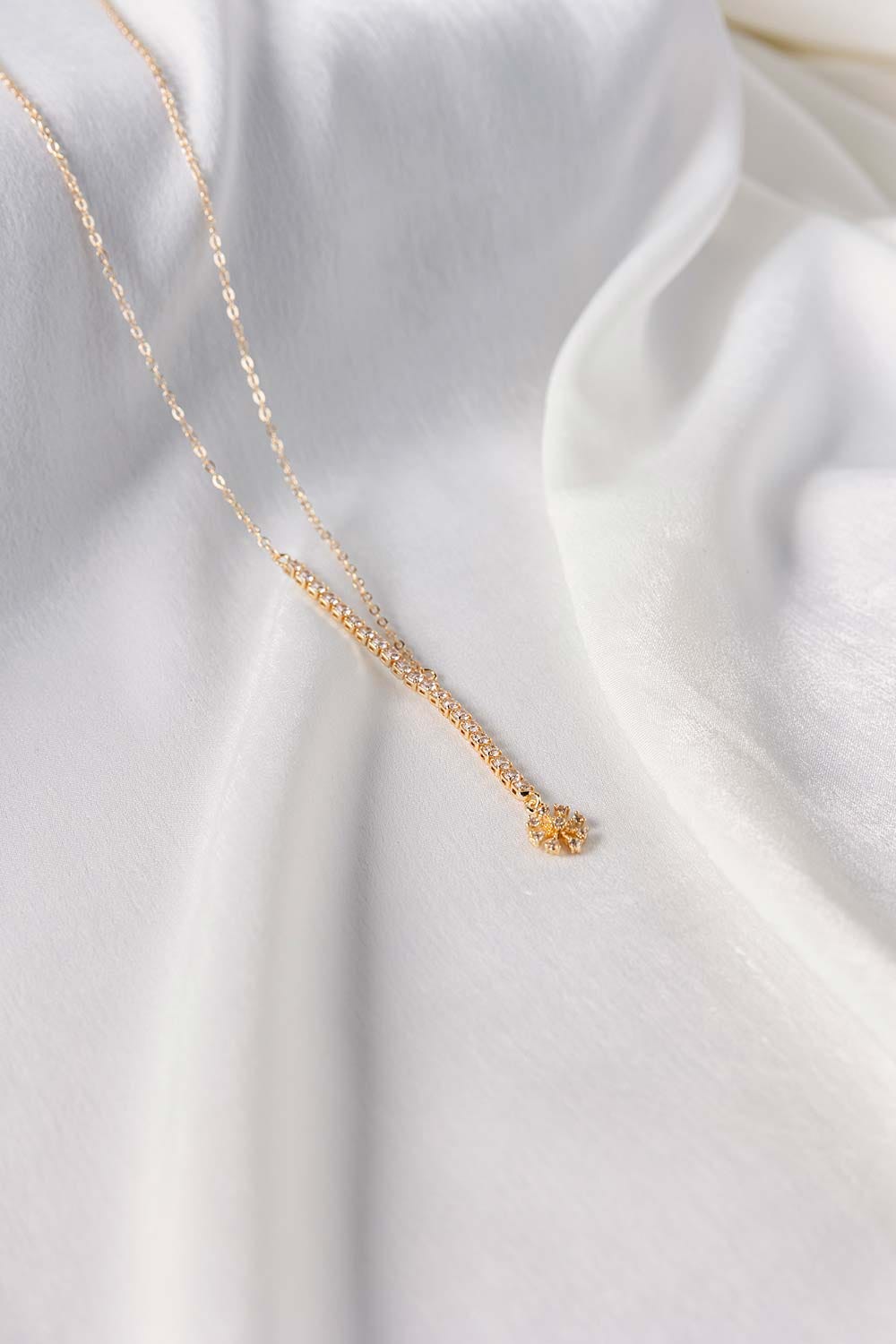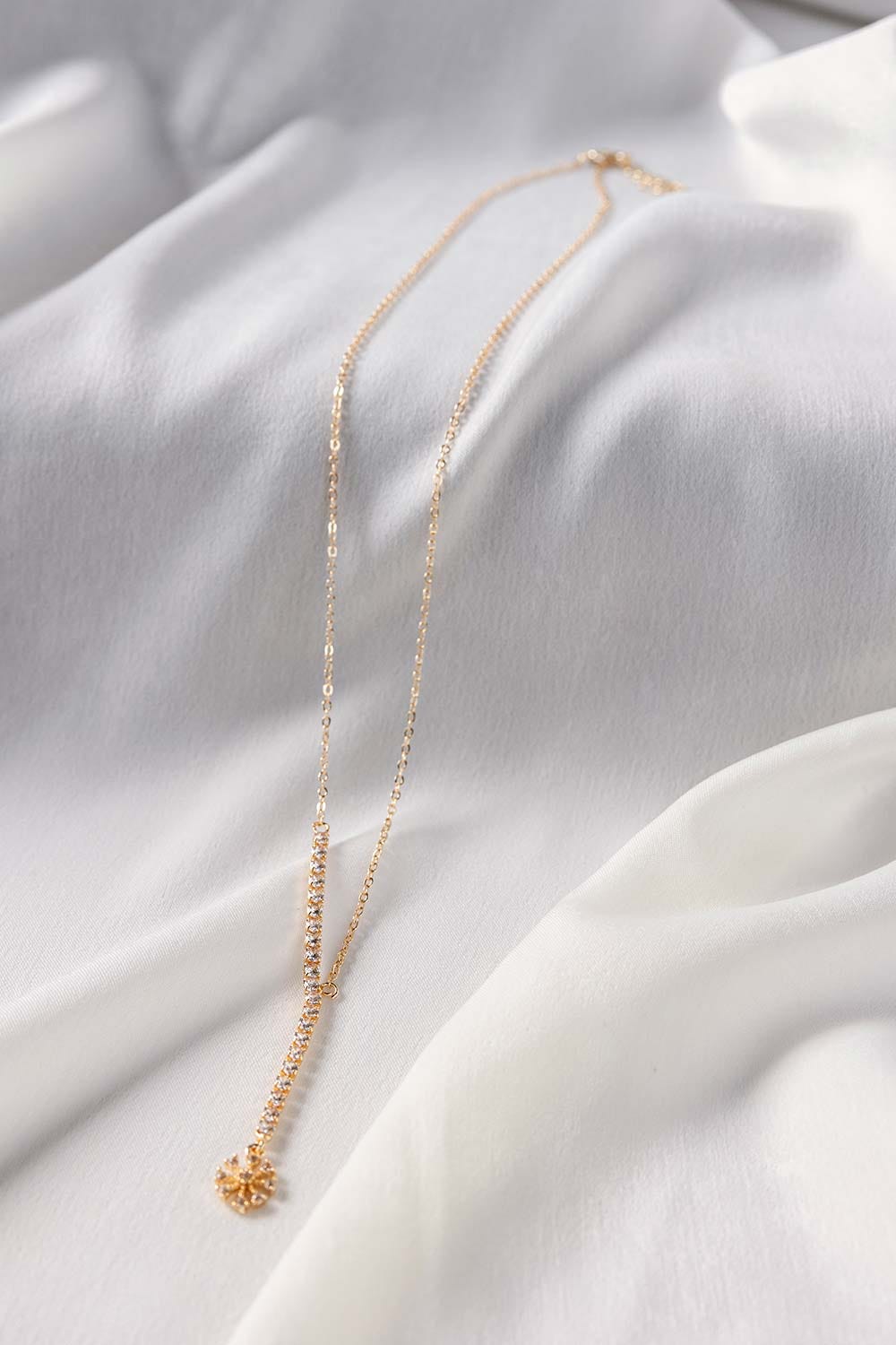 A minimal and delicate Lariat Necklace adorned with artificial zirconium a modern twist on timeless allure. Crafted with precision, this necklace drapes gracefully, capturing the play of light and shadow.